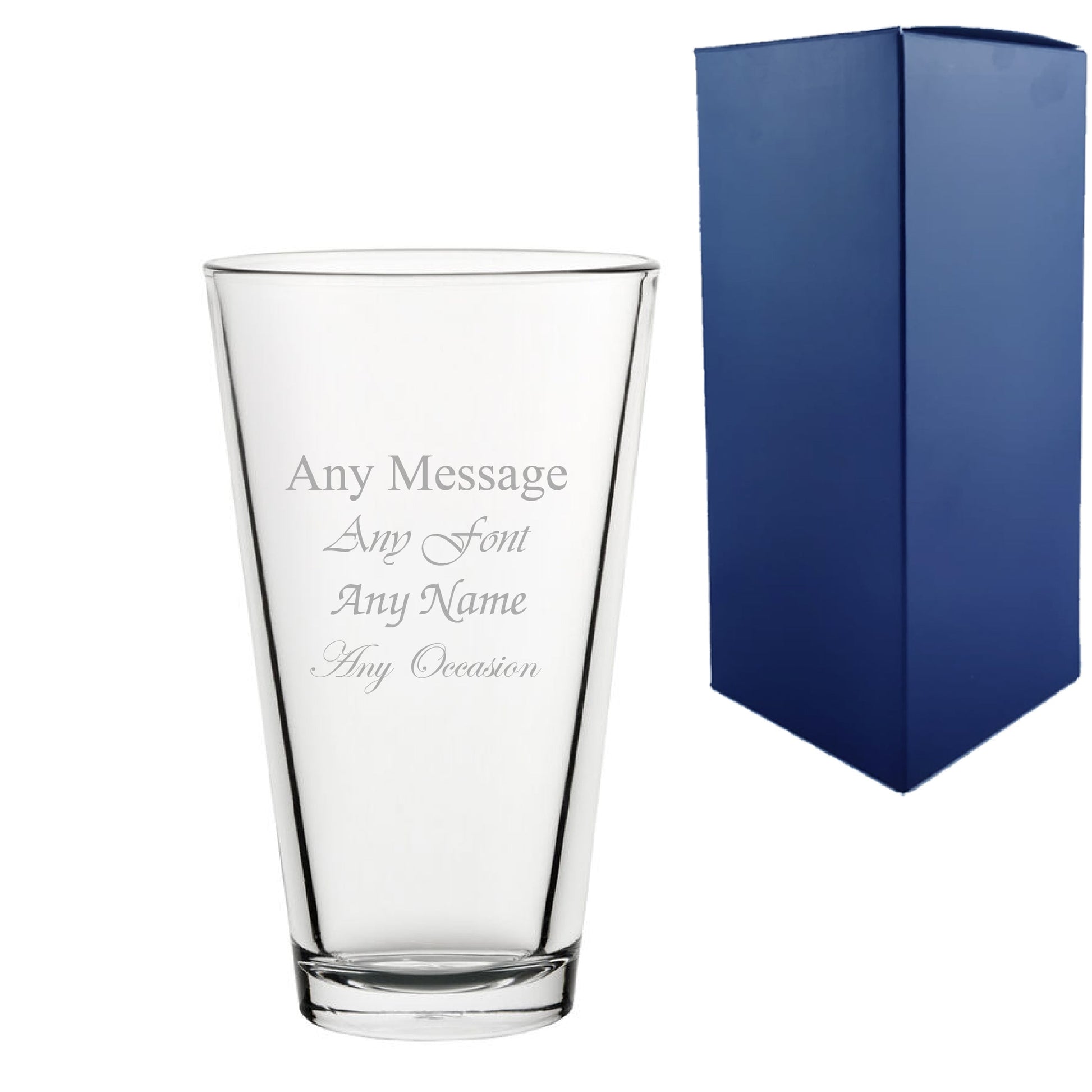 Be ready for any occasion with any personalised message. This personalised engraved glass holds up to 354ml of liquid.Customise this glass with any message and choose from a list of fonts that are perfect for any occasion.No need to worry about the design coming off as this glass is machine engraved and dishwasher resistant. Your glass will be engraved and gift boxed in house, arriving to you ready for its recipient. We recommend always washing your glass before first use. Click the customise now button to see a live preview of what your engraving will look like. Please note that we cannot accept emojis but all text entered will be used, so please check for spelling mistakes!