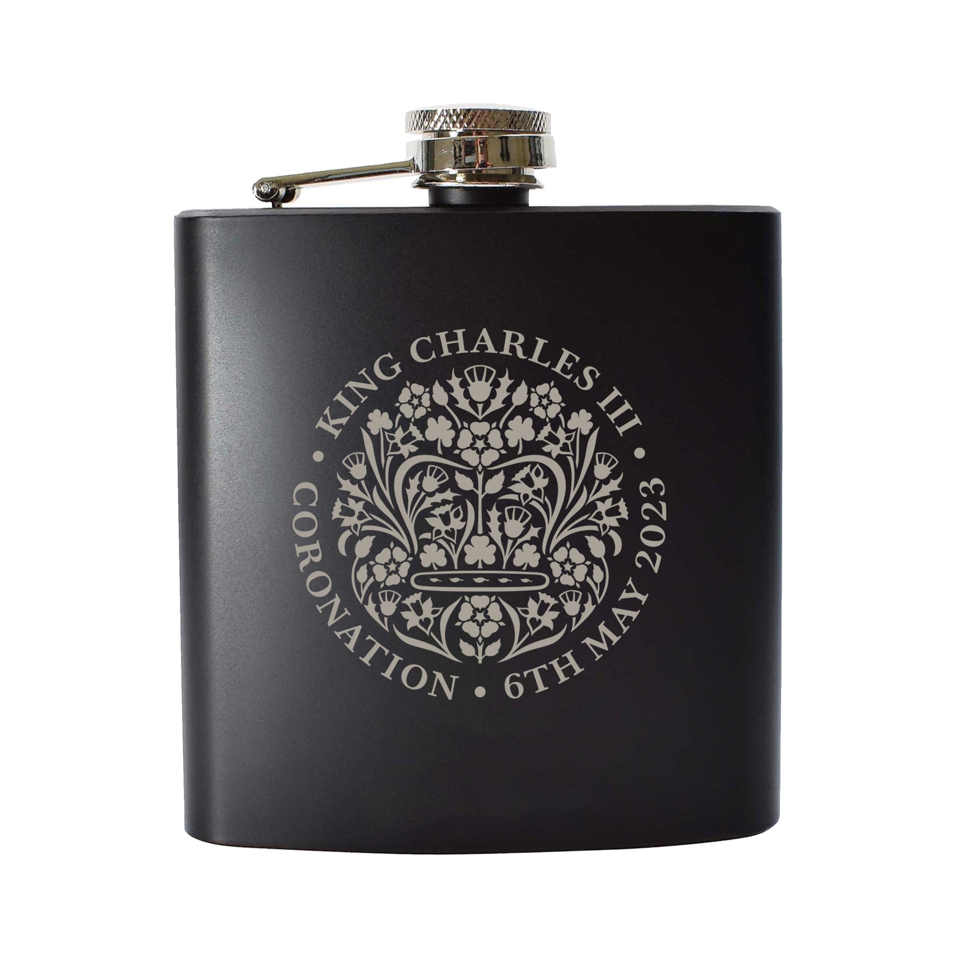 Celebrate the coronation of King Charles the III and the Queen Consort with our King's Coronation Emblem black hip flask. Engraved with the official Coronation Emblem for HRH on 6th May 2023, this flask makes for a sentimental piece to remember the historic, regal event; perfect for coronation parties and celebrations, a gift for a royal family fan or even as a keepsake for the coronation, this flask suits all. The coronation emblem was created by Sir Jony Ive KBE and his creative collective LoveFrom, and displays St Edward's crown comprised of the flora from the four nations of Great Britain. Etched with our laser engraving system, the emblem will be permanently etched into this flask, ensuring this keepsake will be lasting and cherished for years to come. A classic and traditional flask, this holds 6oz and is made from sturdy stainless steel, completed with a stylish matt black finish. This coronation flask is the perfect way to show support to the monarchy and a great token to remember the King's Coronation.