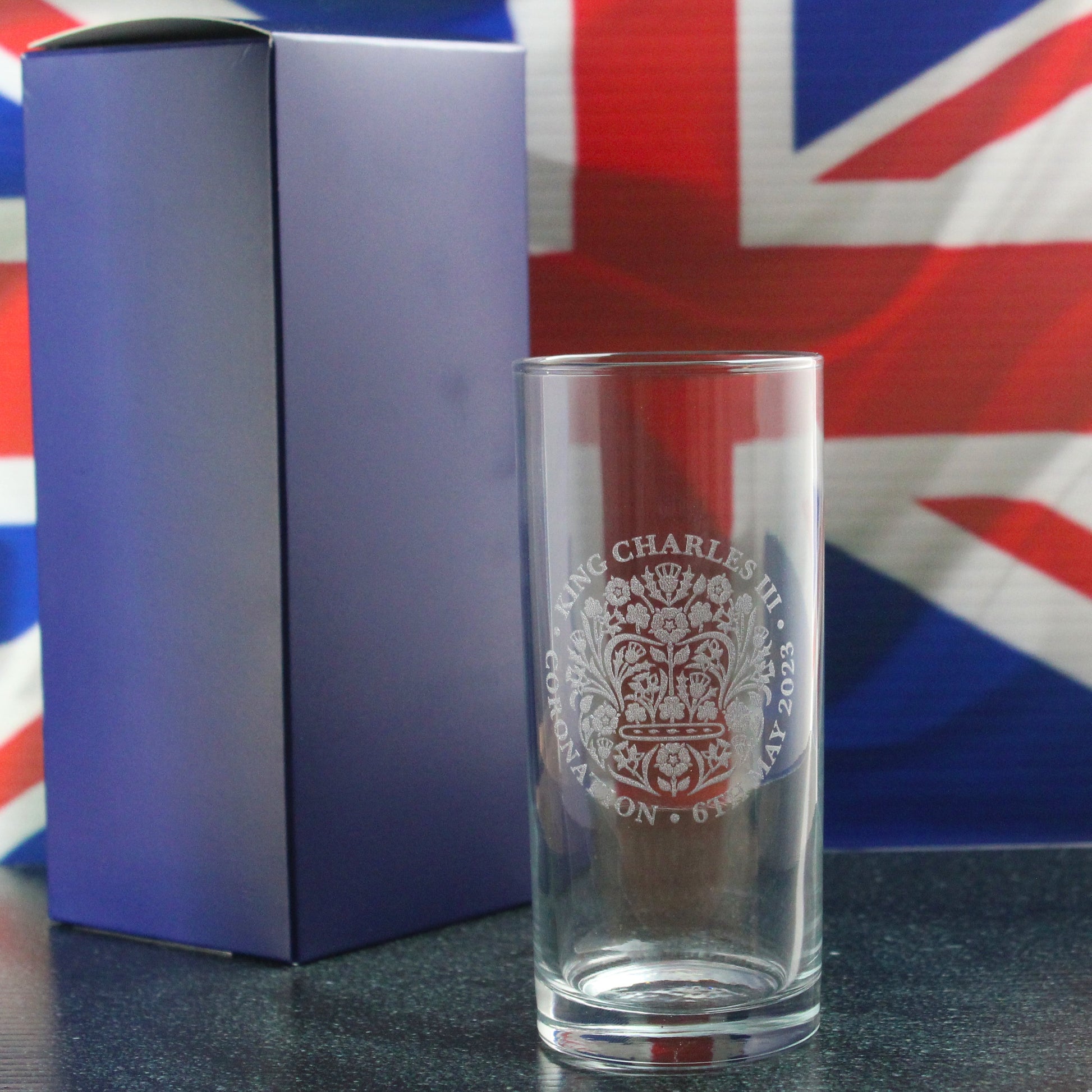 Celebrate the coronation of King Charles the III and the Queen Consort with our King's Coronation Emblem hiball tumbler. Engraved with the official Coronation Emblem for HRH on 6th May 2023, this glass makes for a sentimental piece to remember the historic, regal event; perfect for coronation parties and celebrations, a gift for a royal family fan or even as a keepsake for the coronation, this glass suits all. The coronation emblem was created by Sir Jony Ive KBE and his creative collective LoveFrom, and displays St Edward's crown comprised of the flora from the four nations of Great Britain. Etched with our laser engraving system, the emblem will be permanently etched into this glass, ensuring this keepsake will be lasting and cherished for years to come. A straight sided hiball tumbler, this glass holds 12oz and shows a traditionally shaped silhouette. A versatile drinking vessel, this glass is perfect for soft drinks, juices and water, as well cocktails and mixers with spirits. This coronation glass is the perfect way to show support to the monarchy and a great token to remember the King's Coronation.