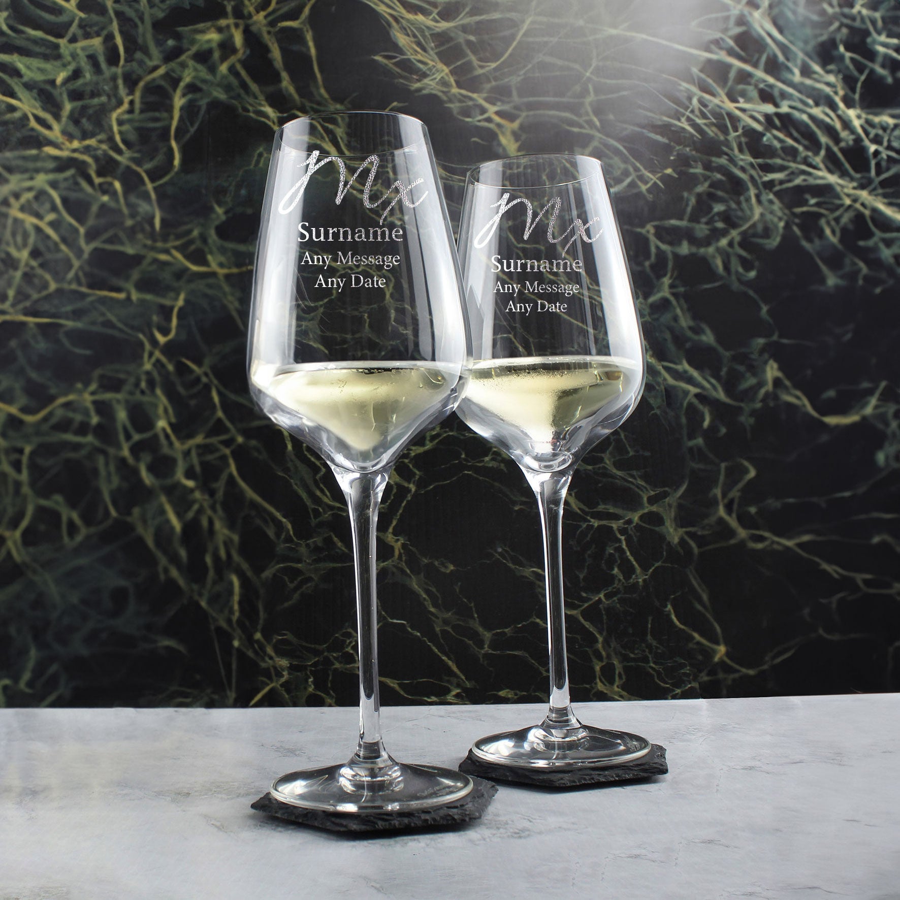 These matching gender neutral couples engraved Wine glasses are a great way of enjoying a bottle of red with a significant other with an extra special personalised engraving to commemorate their love together. You can customise the marriage titles you would like to have. This can include two non-binary people (Mx and Mx), one male and one non-binary person (Mr and Mx), or female and non-binary (Mrs and Mx). It could even be two doctors (Dr and Dr). This set of glasses include two large crystal wine glasses with a generous 450ml/15.8oz capacity, perfect for aerating a aromatic red wine. They also arrive in stylish matching boxes, ready to be gifted. No need to worry about your personalisation washing off, as these glasses are dishwasher resistant and have a permanent engraving. We recommend washing before first use and between uses. Please note that we use character limits to insure your engraving fits correctly on the glass. Your details will be used exactly as submitted so we kindly ask you to double check your personalisation details to avoid any spelling errors. Whether you're searching for a thoughtful anniversary gift, a special wedding present, or simply a way to celebrate the bond between two individuals, these engraved personalized gender neutral wine glasses are an excellent choice. They serve as a daily reminder of the connection and love shared by the couple.