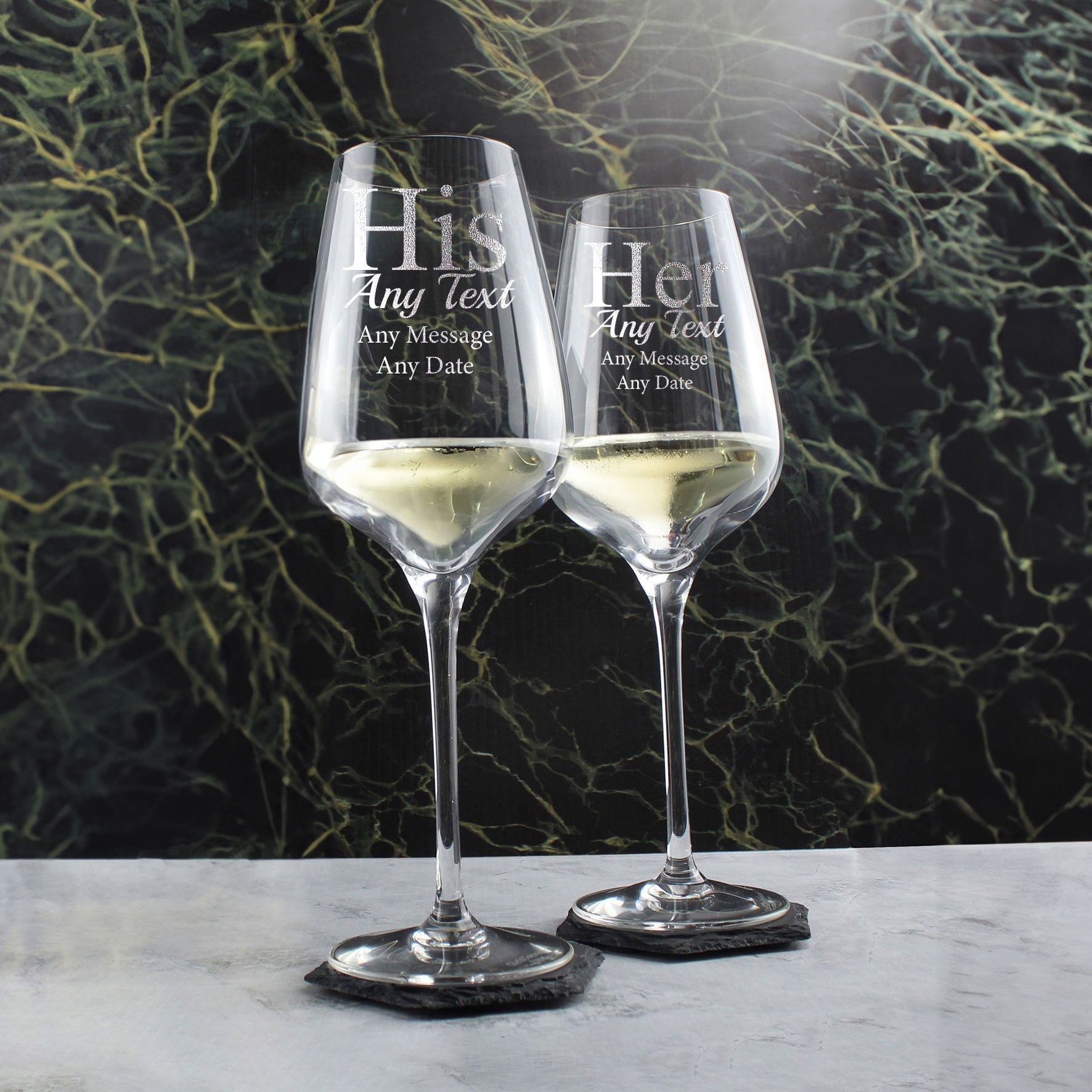 These matching engraved 'His and Hers' wine glasses are a great way of enjoying a bottle of red with a significant other, with an extra special personalised engraving to commemorate their love together. This set of glasses includes two large crystal wine glasses with a generous 450ml/15.8oz capacity, perfect for aerating an aromatic red wine. No need to worry about your personalisation washing off, as these glasses are dishwasher resistant and have a permanent engraving. We recommend washing before first use and between uses. Please note that we use character limits to ensure your engraving fits correctly on the glass. Your details will be used exactly as submitted, so we kindly ask you to double-check your personalisation details to avoid any spelling errors. Whether you're searching for a thoughtful anniversary gift, a special wedding present, or simply a way to celebrate the bond between two individuals, these engraved personalised 'his and hers' wine glasses are an excellent choice. They serve as a daily reminder of the connection and love shared by the couple.