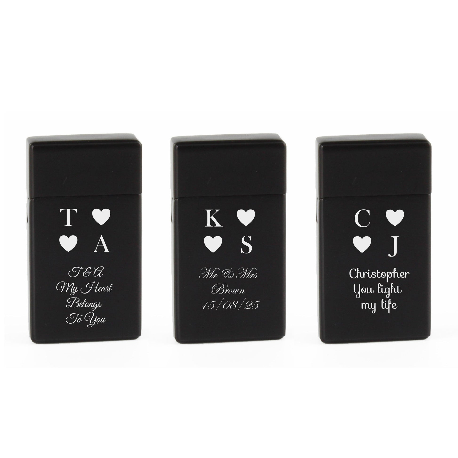 Engraved Jet Gas Lighter Black Heart Initials Gift Boxed