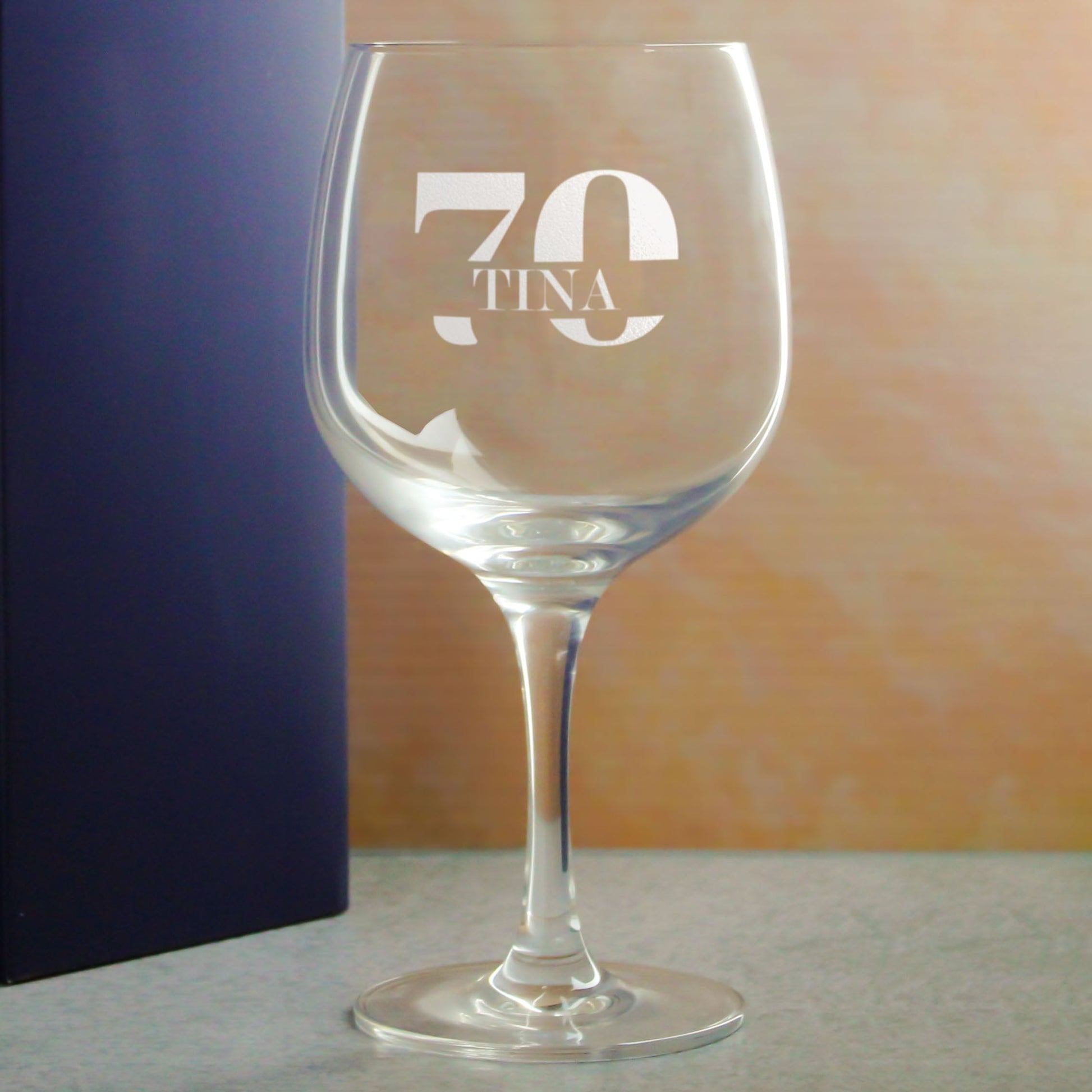 Get ready to add a splash of personality to your gift-giving game with this engraved gin glass! This striking cocktail glass features This striking cocktail glass features a large, bold design of the recipients age with their name written through the middle, creating an impressive birthday gift for any gin or cocktail lover alike; with the addition of their name, this creates a item that is uniquely theirs and makes for a thoughtful, affectionate present. The design and personalisation are laser-engraved onto the glass's surface, making sure every detail stands out crisp and clear, and ensures a lasting sentimental gift. Completed with a tastefully designed gift box, the glass is presented tastefully to the recipient, saving the hassle of gift wrapping and presentation. The box features a transparent window, offering a preview of the gift it holds. Standing at 215mm tall and 107mm wide, the glass boasts both practicality and tradition with it's classic balloon design, offering a large capacity that's tailored for any cocktail (especially G&Ts). Whether as a gift for your best friend, celebrating an anniversary or just to show someone how much they mean to you, this engraved gin glass is ready to make a statement - it's a thoughtful gift that perfectly blends the fun of a casual hangout with the sentiment of a heartfelt keepsake.