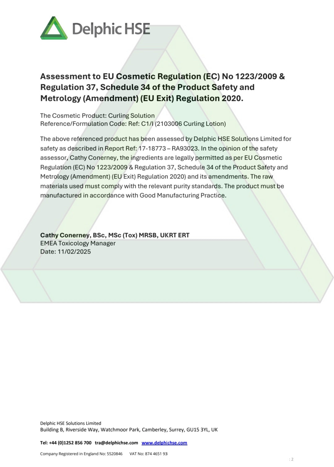 Aqua, Ammonium Thioglycolate, Cetearyl Alcoho,1 Ceteareth-20, Ethanolamine, Ammonium HydroxideGlycern, Paraffinum Liquidum (Mineral Oil), Sodium Gluconate, Polyquaternium-6, Phenoxyethanol, Parfum, Chamomilla Recutita (Matricaria) Flower Extract, Hydrolyzed Com Protein, Hydrolyzed Wheat Protein, Hydrolyzed Soy Protein Dimethicone, Ethylhexylgycerin, Tetrasodium EDTASodium Sulfite, Propylene Glycol, Cl 16035 (FD&G Red No. 40)