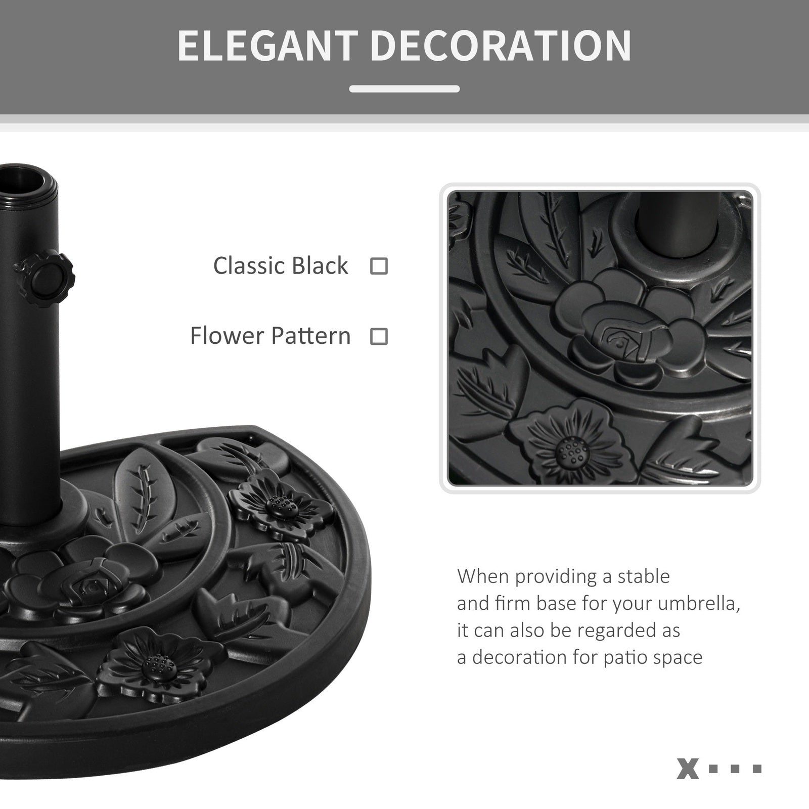 Incorporate elegance into your garden furniture with this half parasol umbrella base from Outsunny. Made from a blend of HDPE, cement and metal and weighing 10kg, it can withstand heavy rain and wind conditions, making it suitable for use all year round. In a versatile black hue, it features a top engraved with a delicate and beautiful flower design and it is finished with a tightening screw to hold the parasol pole securely in place all day long. Its the perfect combination of beauty and functionality.