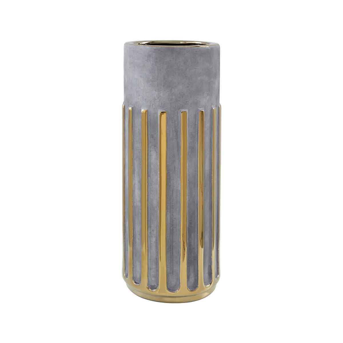 The Harlie ceramic vase features muted grey hues with a mix of vertical veining detail in the warm metallic finish. Creating an instant focal point, this versatile accent piece is well-suited for floral display.