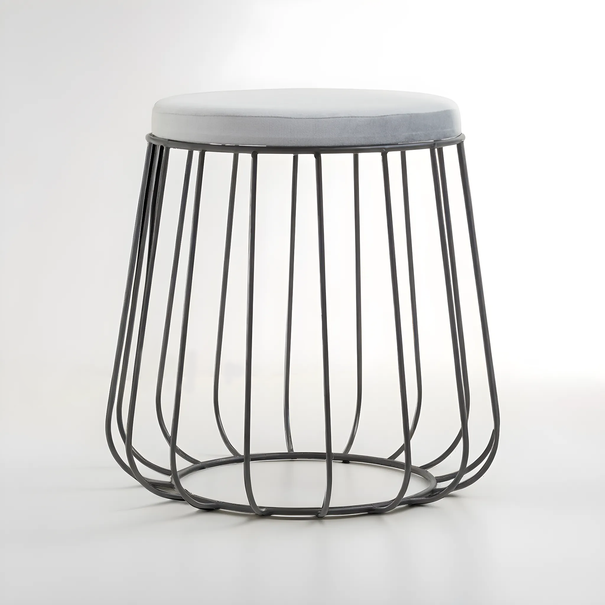 Upholstered in plush grey velvet, this modern stool has a round velvet seat that offers comfort and tactility. The seat is supported by a black metal frame in a birdcage design that adds modern industrial aesthetics. Ideal for the bedroom, living room, and hallway, this minimalist yet contemporary style stool is a perfect addition to your home.
