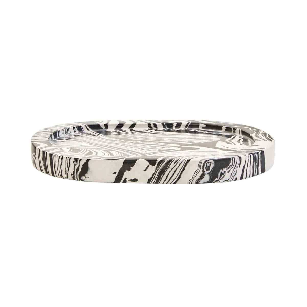 Handcrafted from two tonal marble, this decorative tray boasts an oval shape with raised edges, accentuating its modern aesthetics. Ideal for keeping essentials close at hand, this tray can be displayed as a standalone decorative piece in modern decor settings.