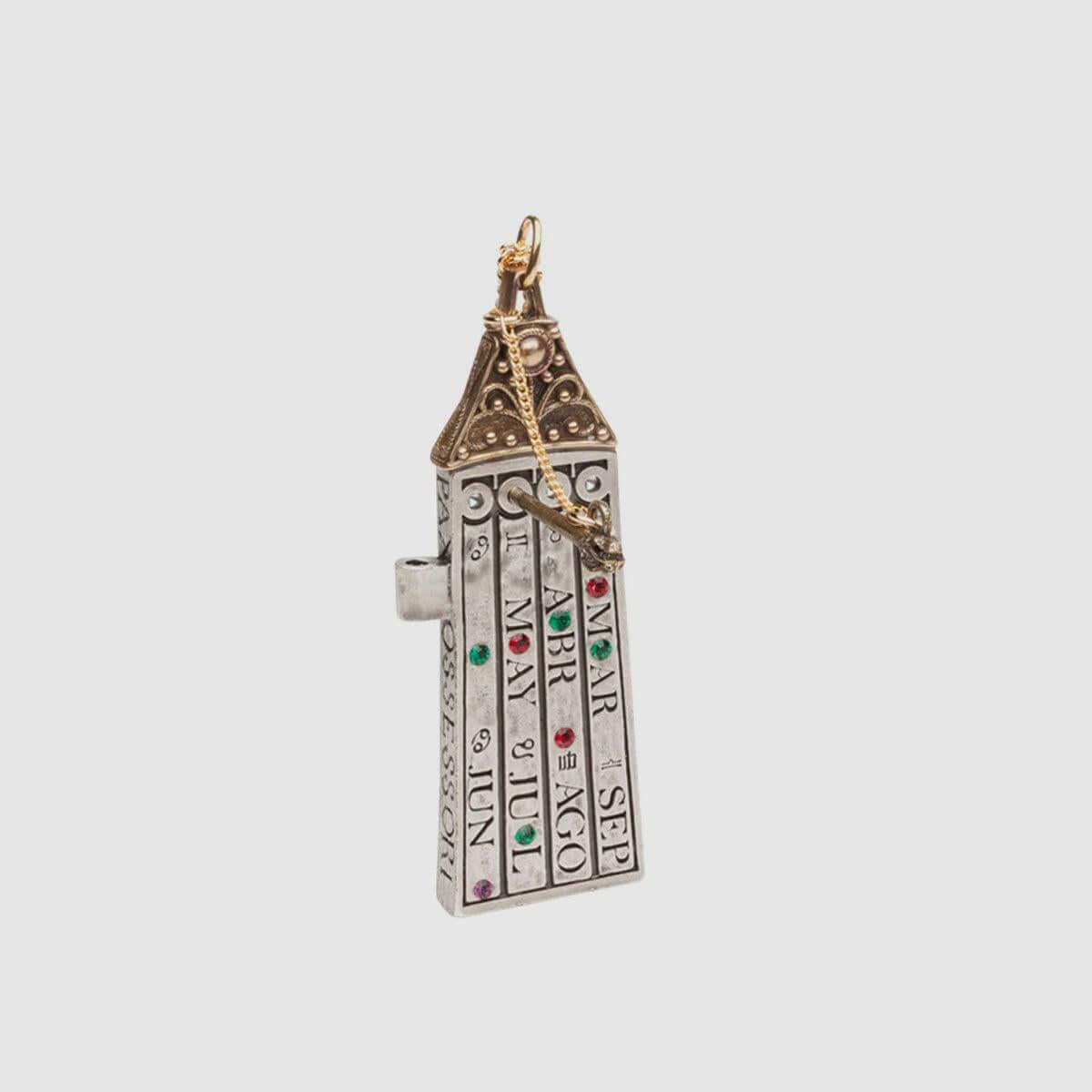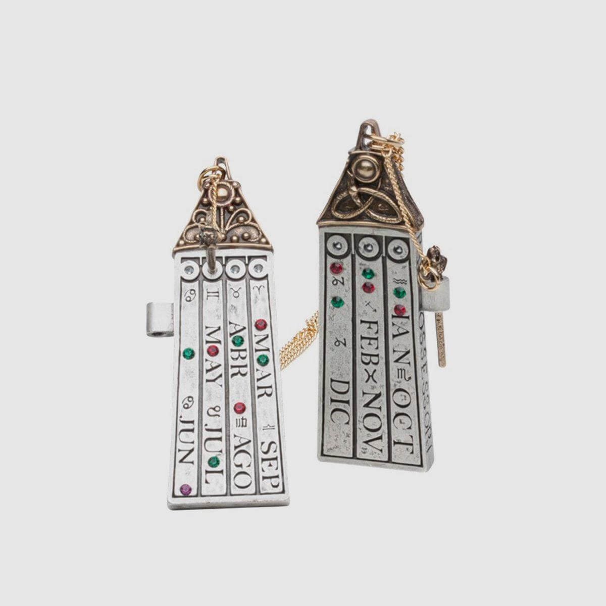 This piece is a sundial for prayers and mass hour. The original jewel was found in an archaeological dig at the House of Agnes, in Canterbury, England. It is believed to date from 1388 and is currently held in the British Museum in London.