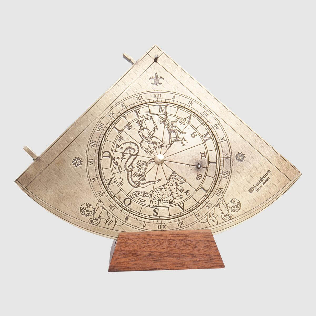 On the face side, the instrument presents a local height quadrant furnished with a fin for establishing the Sun’s height and a plumb with a sliding pearl. It contains a series of scales, some of them based on the stereographic projection, that enables the user to find out the time and solve several calculations related to the Sun’s position.