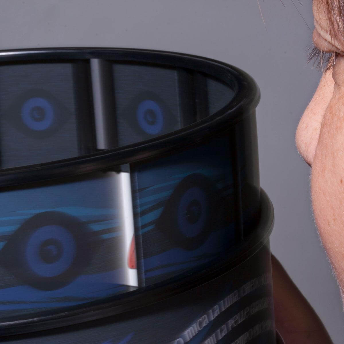 To view the animation, turn the drum and then, by looking through the slots, watch the images move. A slow-motion effect can be created by slowing the speed of the drum.