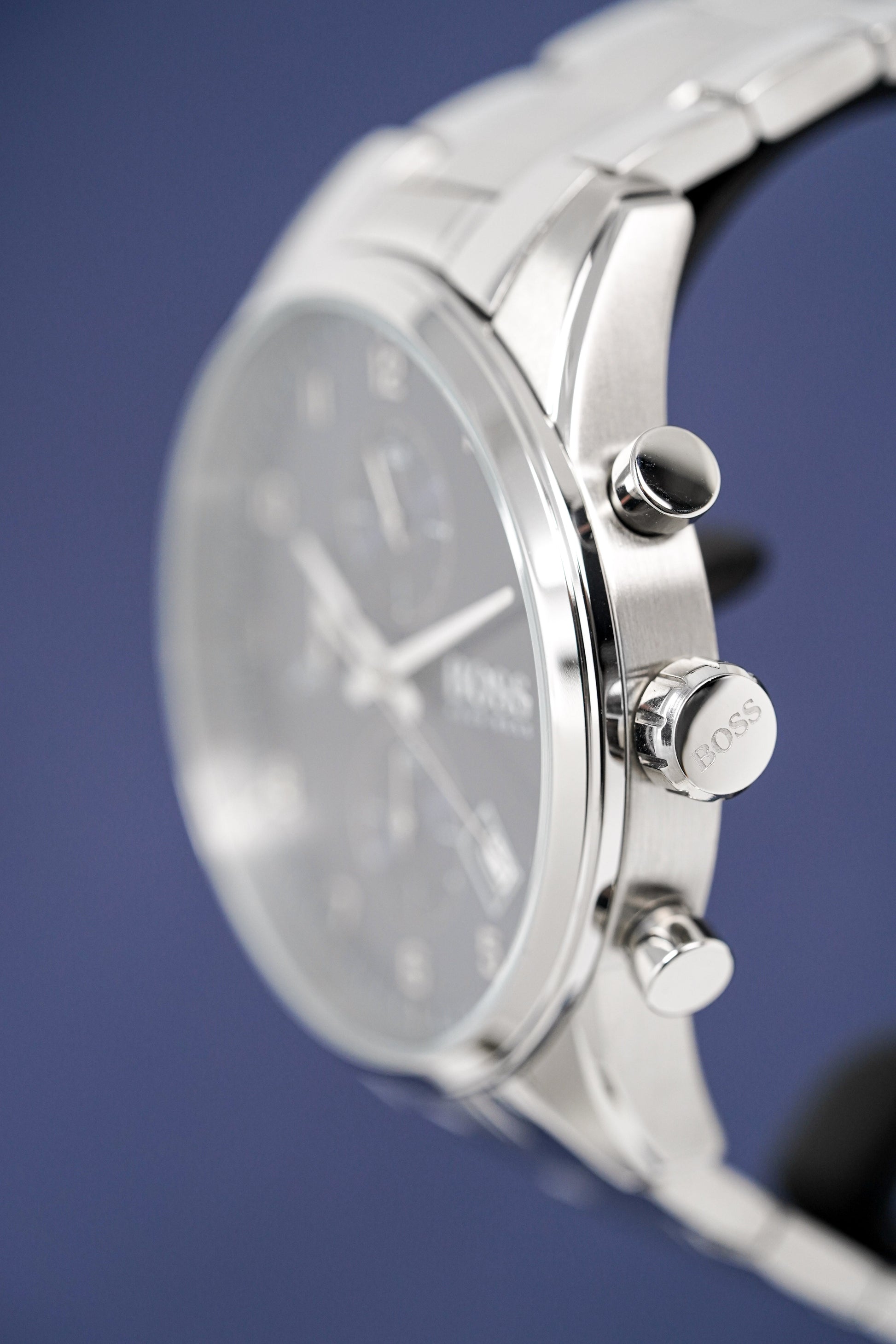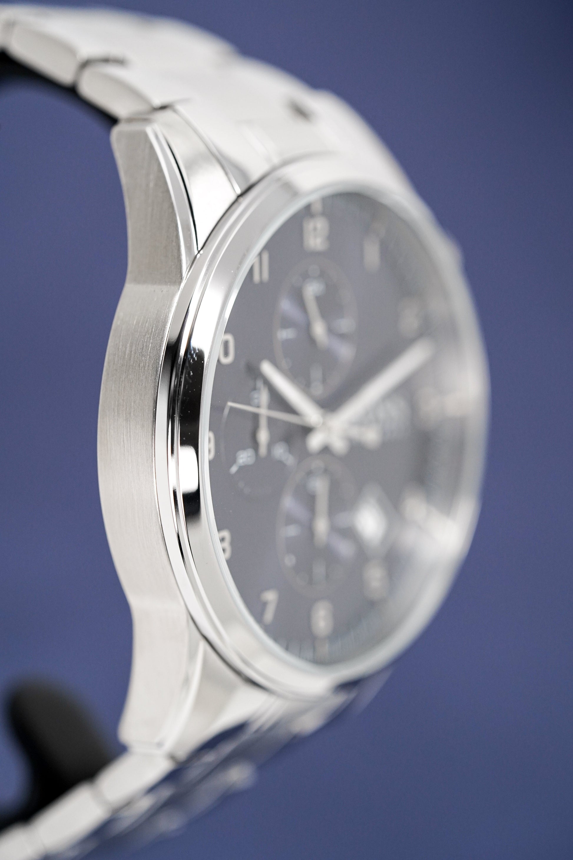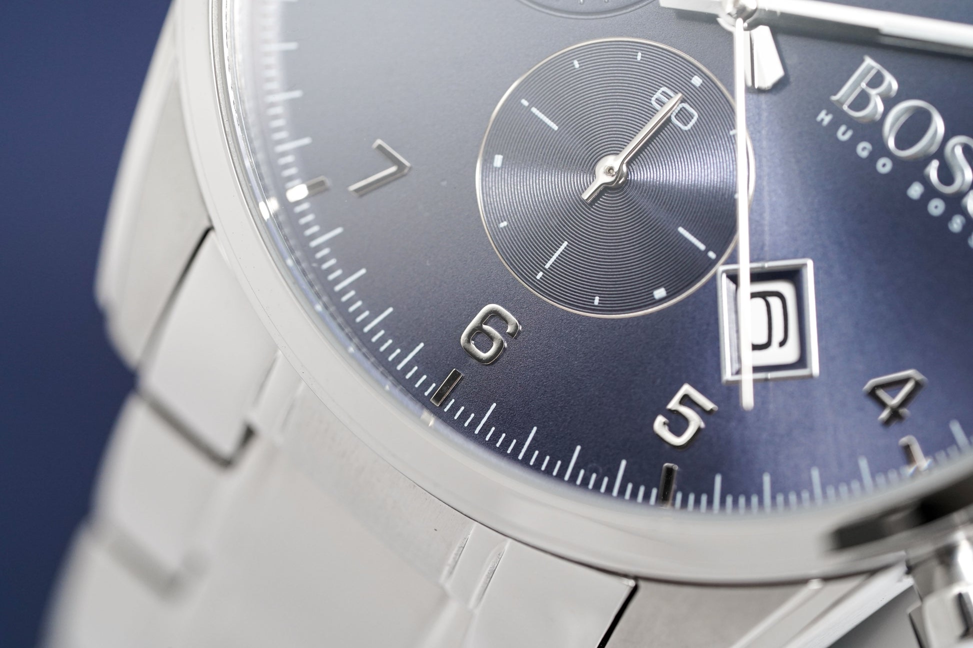 Blue Sunburst Dial. Luminous Steel Hands. Stainless Steel Arabic Numerals. Date Window at 4:30.