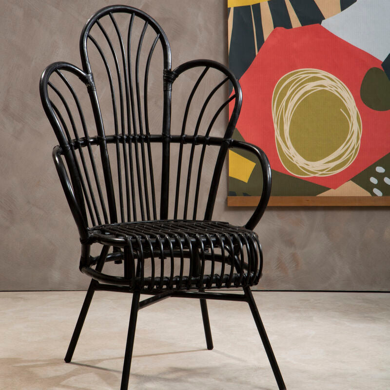 This black chair is an organically charming accent piece for your living room featuring a robust build combined with chic design. The black finish durable metal frame with a scalloped back is woven with matching toned natural rattan. The seat and back of this rattan chair is supported by sleek black metal legs, coordinating with the overall look.