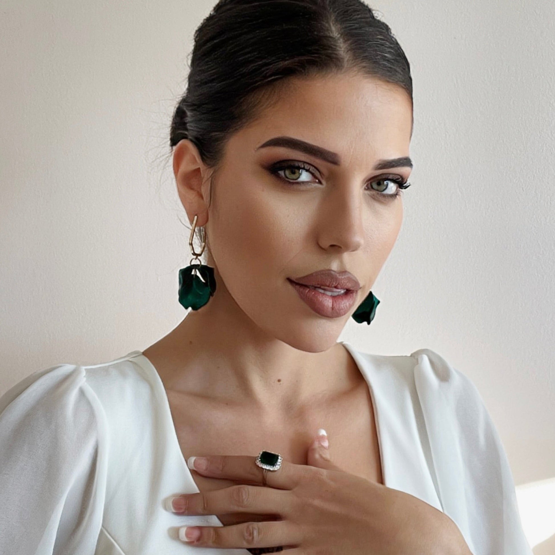 Make a statement with these bold Juni Emerald Green Petal Earrings. Large, bright and daring, they will add a splash of vibrant color to any look! Take a risk and show your daring side!