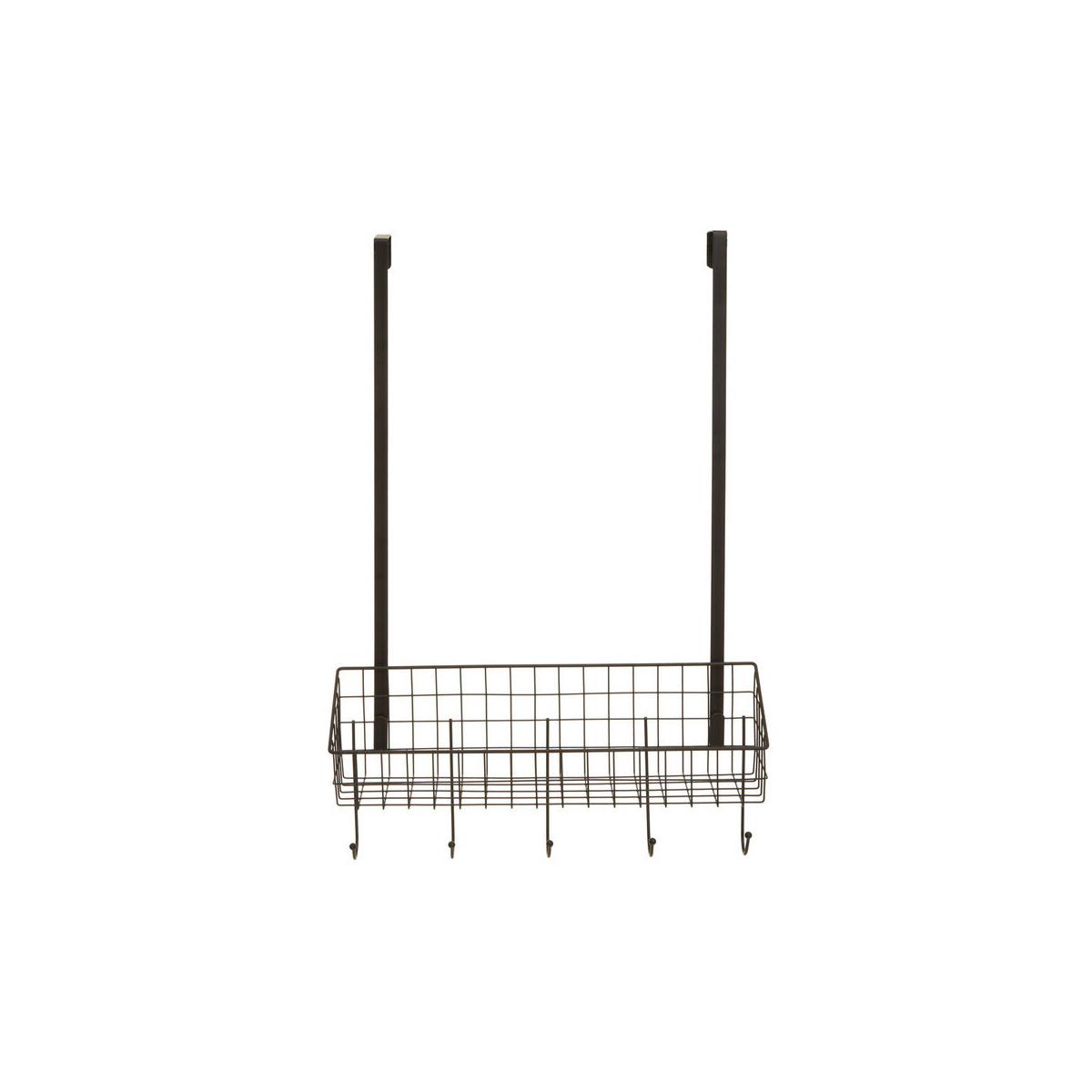 This over the door hanger shelf with five additional hooks, is ideal to store or hang a variety of accessories. The sturdy iron wireframe is adorned in a smooth black finish that prevents rust and scratches.