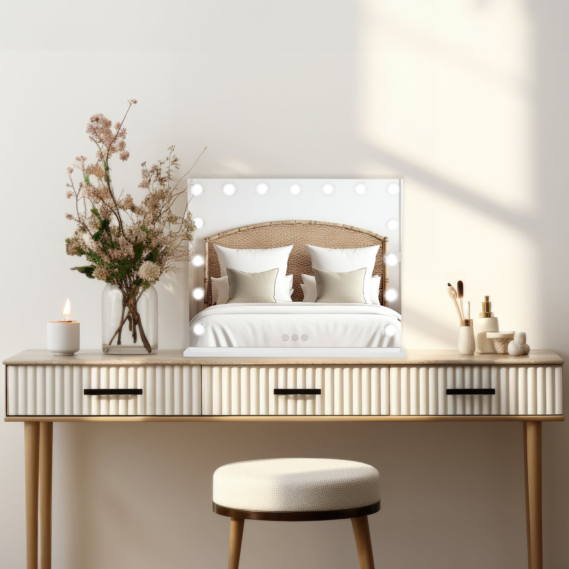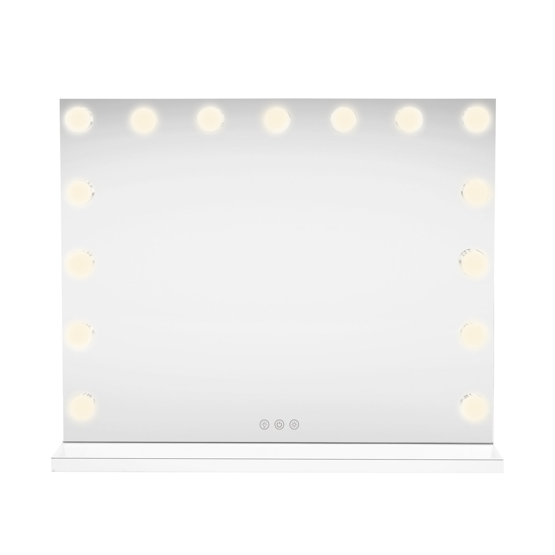 Designed for both makeup enthusiasts and professionals, this versatile mirror excels in makeup application, skincare routines, and hairstyling. Its sleek, modern frame is complemented by 15 dimmable LED bulbs, enhancing any room with a touch of sophistication.