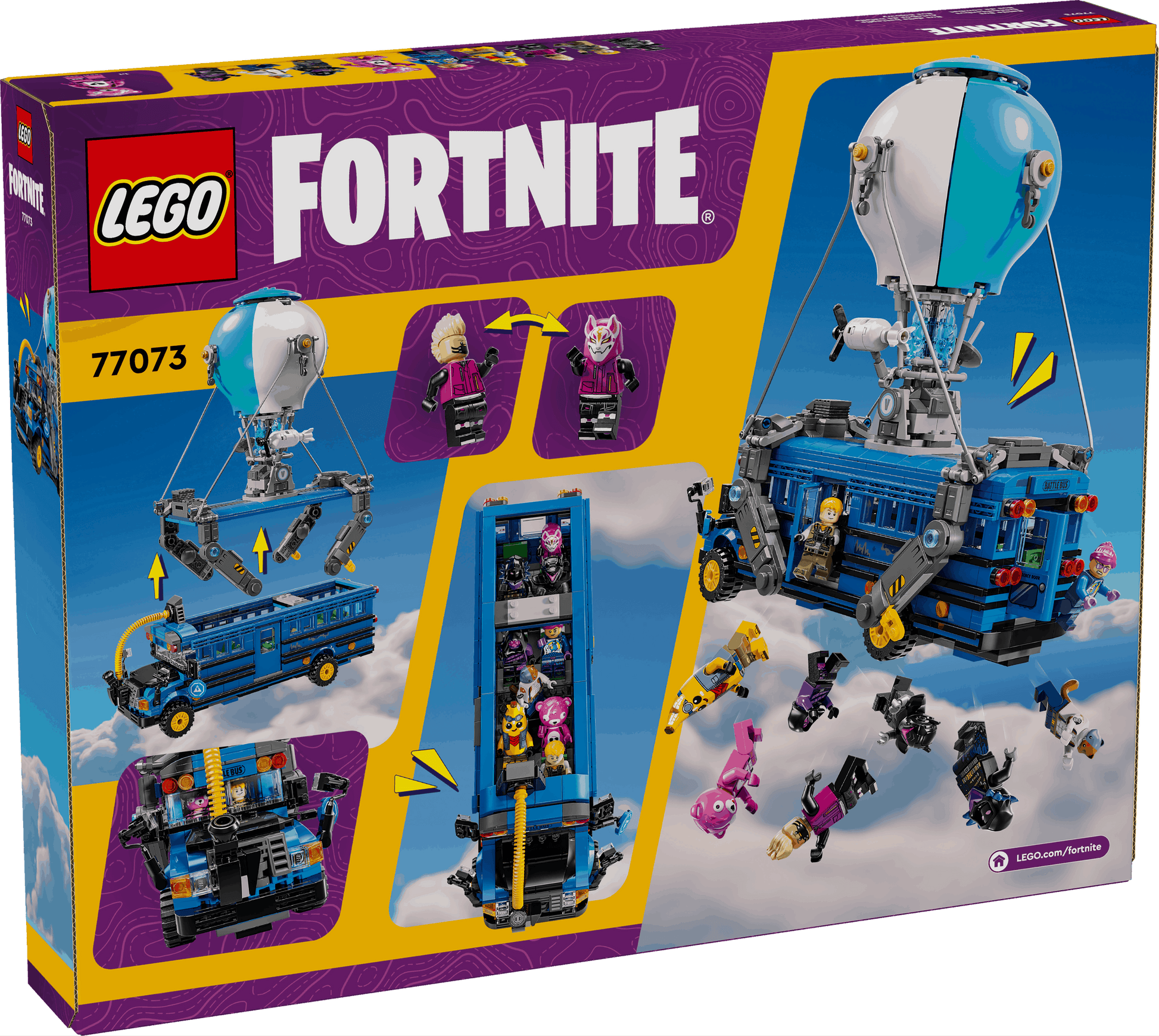 Once the bus toy is complete, they’ll delight in discovering iconic accessories such as Slurp Juice, a Grappler, Pickaxes and Slap Juice, as well as 9 minifigures of iconic Fortnite characters.
