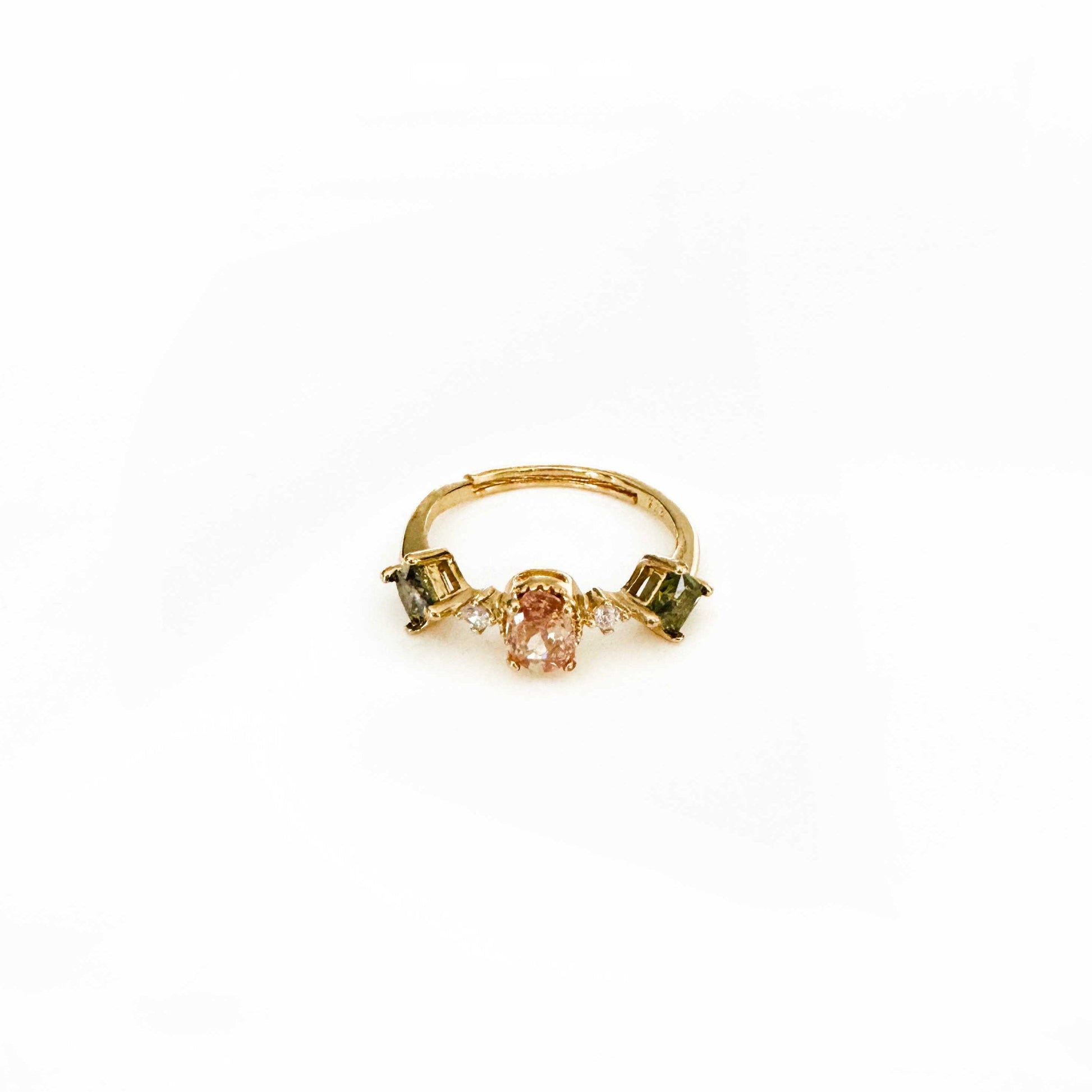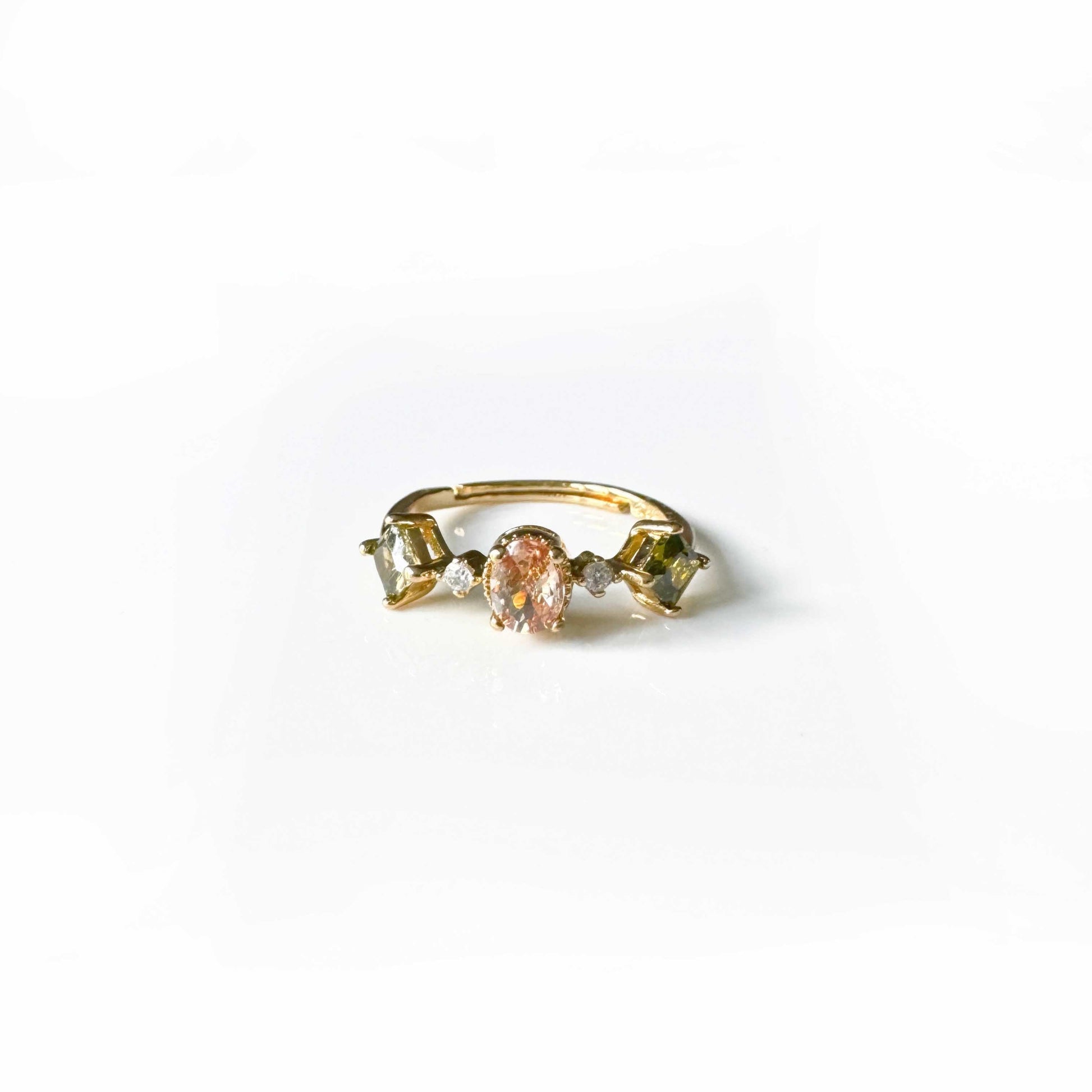 Discover elegance with this unique gold ring, showcasing a captivating peach-colored center gemstone accented by two rich green side stones. Crafted for those who appreciate distinctive style, this ring is perfect as an understated statement piece. Its warm tones and intricate design make it a beautiful addition to any jewellery collection.