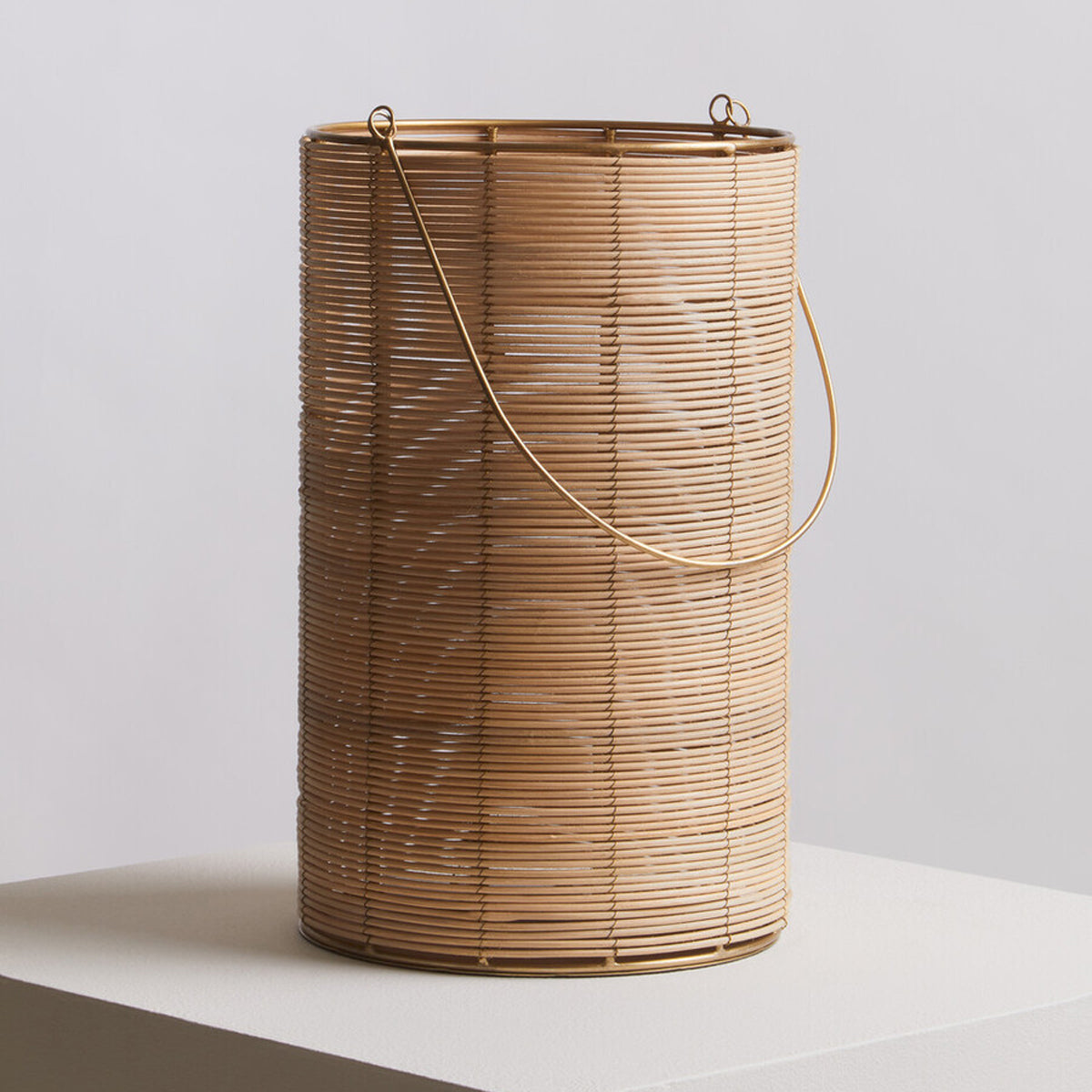 Expertly crafted from a gold finished iron frame, this hurricane candle holder features intricate eco-friendly rattan weaving, creating a round shape. The natural rattan candle holder has a matching toned sleek and curved handle further accentuating its simplistic elegance. This large candle holder is ideal for outdoor areas like patio or porch and indoor living spaces.