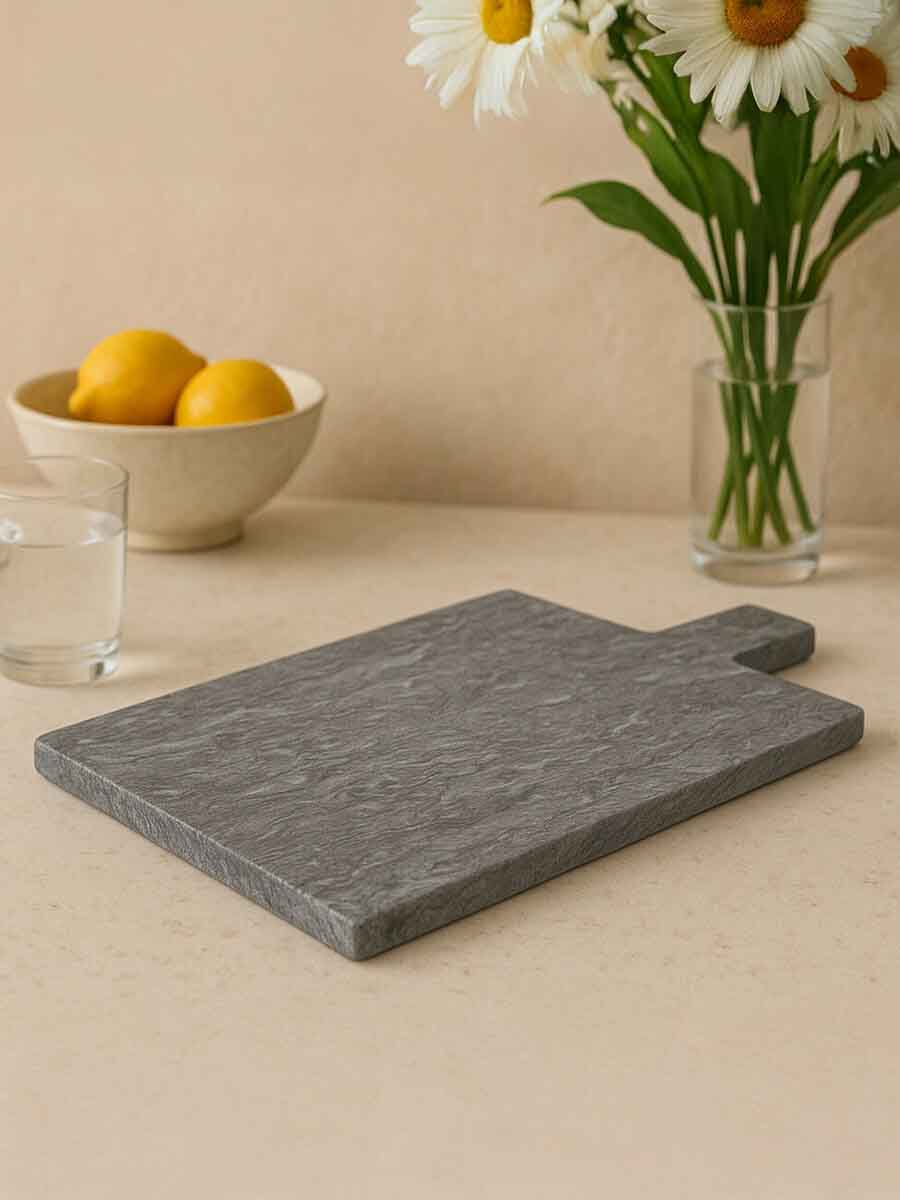 This large paddle board brings elegance and practicality to the tabletop while serving food. Made from sturdy black marble, this versatile board boasts a rectangular shape with a wide handle for a firm grip.
