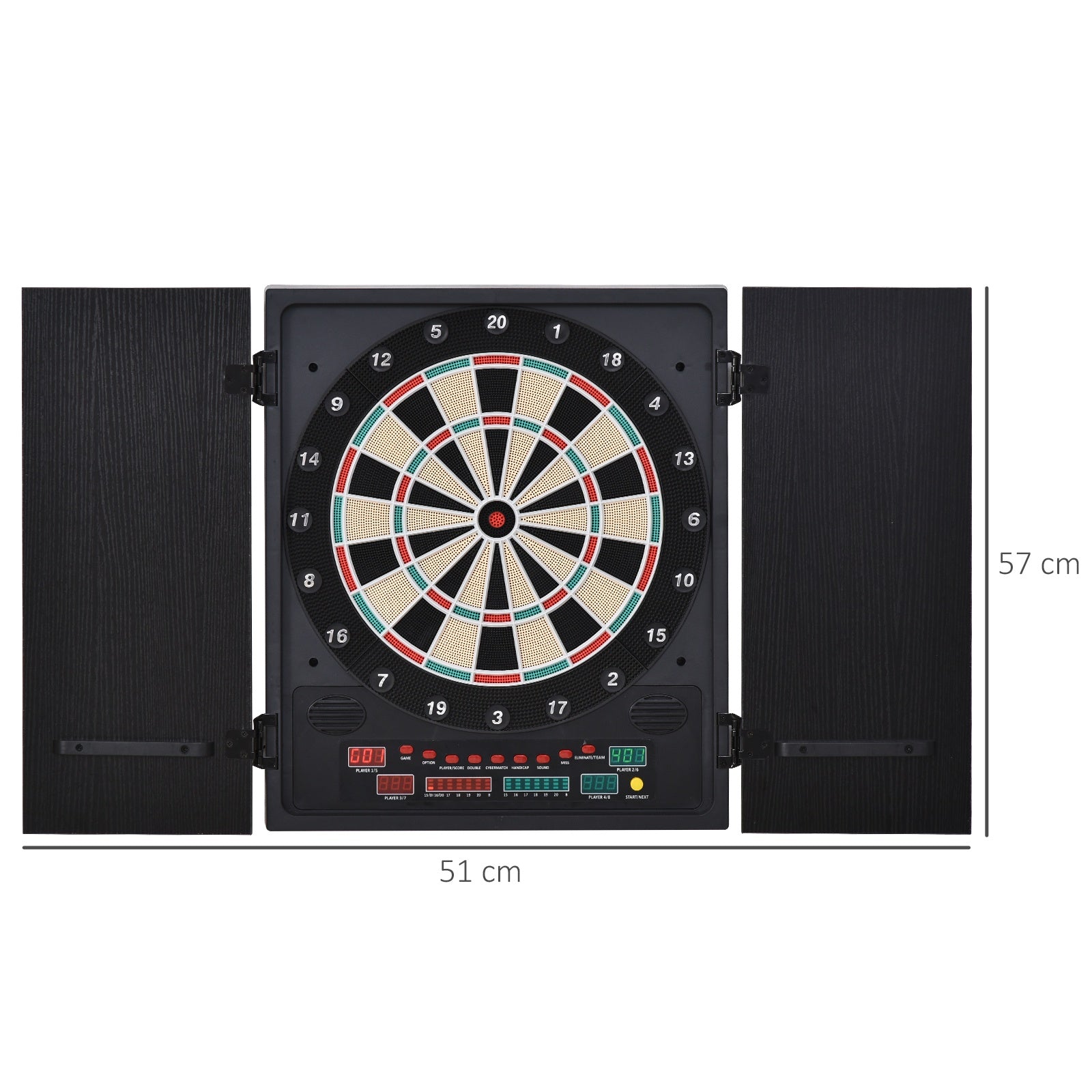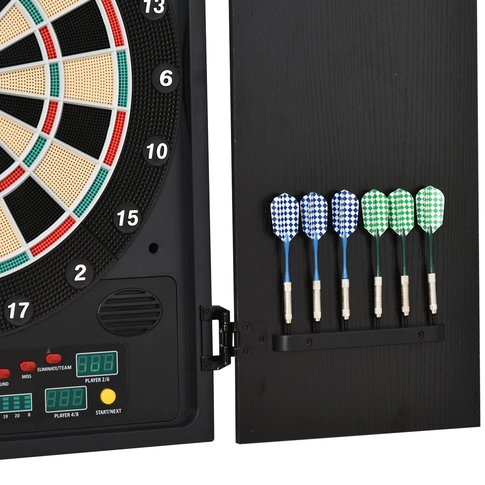 Bring classic game fun to the home with this LED dartboard from HOMCOM. A luxe design which features a dartboard in a two door casing to protect the board when not in use. The inside of the doors hold the darts for safe keeping. A large catchment area allows any missed-spot darts to collect and avoid damaging any other areas. The LED panel on the bottom keeps track of the score so you don't lose track, with 27 games and 202 different scoring options. Volume is adjustable.