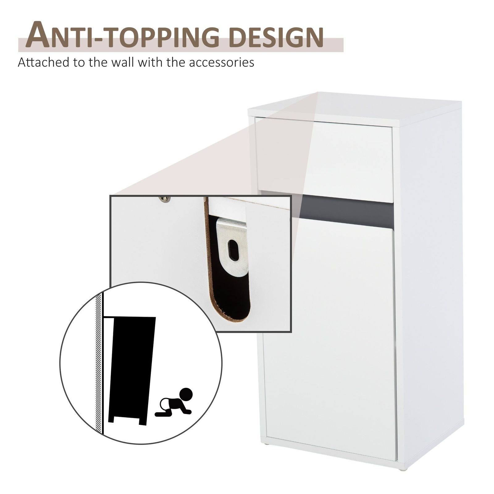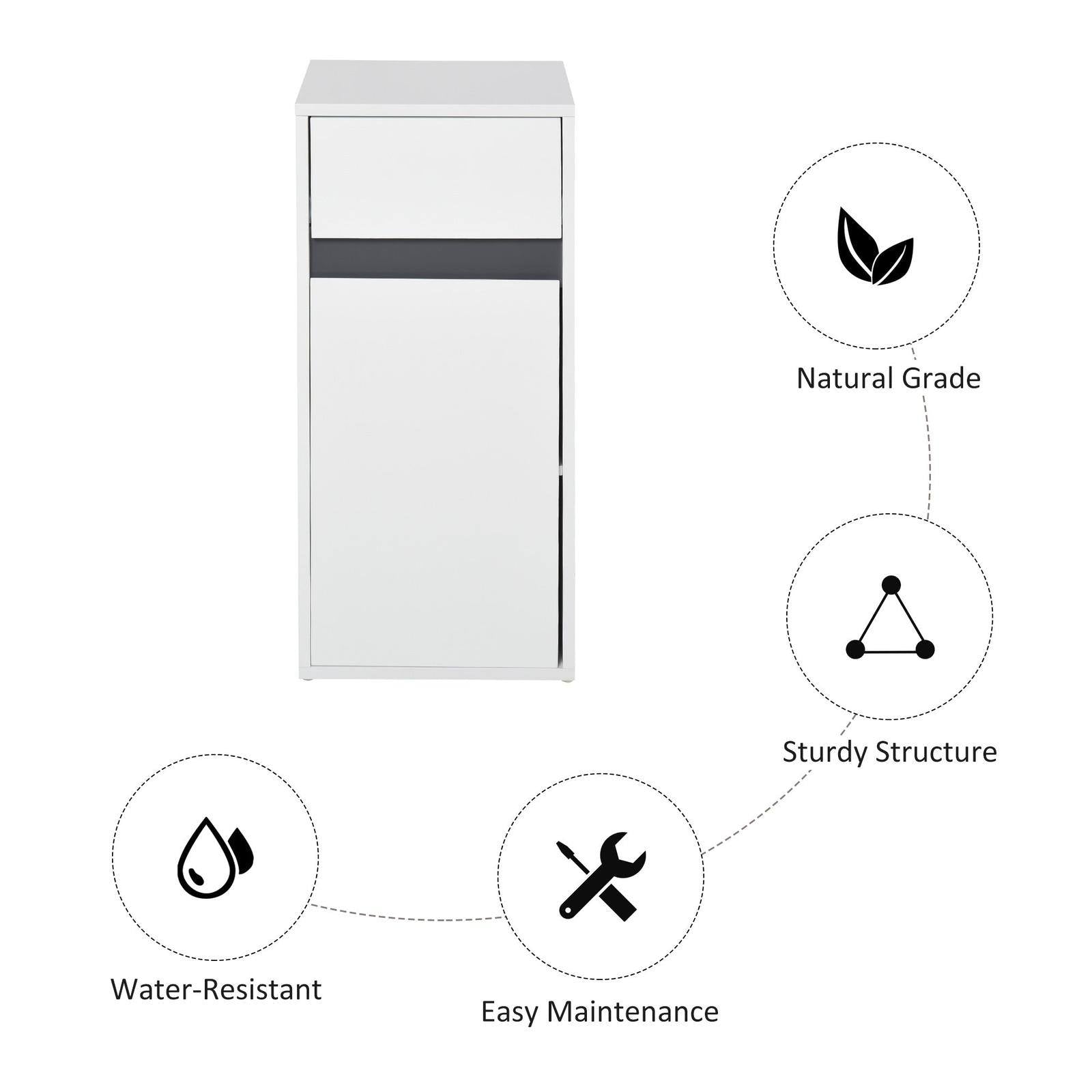 Introduce modern styling into your bathroom with this storage cabinet from HOMOM. Using white moisture-resistant MDF for the structure, and crafted into an effortlessly sleek design, it features a cupboard and drawer - both which are discreetly concealed so your bathroom adopts an ultra-tidy feel. Inside the cupboard, an adjustable shelf is placed to organise your bottles, toiletries and other products. Slightly small in size, it will perfectly fit into places with little space to spare, and it is finished with a flat top for extra holding room if required.