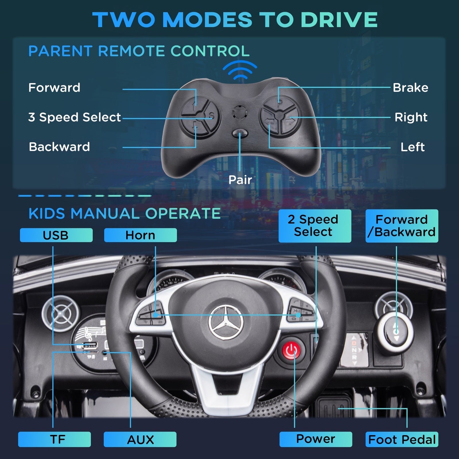 With the Mercedes Benz SLC licensed electric cars, kids can cruise in style, whilst listening to their favourite songs, using the AUX and USB port or the TF card slot. It also comes with eight tracks to listen to. A steering wheel, horn and LED lights are included like a real car. Seatbelt for safety, whilst the wide wheels and suspension system ensures a smooth ride. Adults can join the fun by using the remote control, so the whole family can enjoy this snazzy electric car for kids.