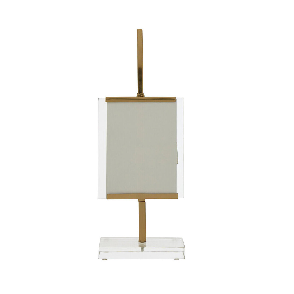 This photo frame has a gold finish stainless steel frame featuring an easel design which holds a white canvas-like background for displaying photographs. The frame has a rectangular acrylic base which contrasts the translucent, front panel. Small, removable bolts on the back of the luxe frame can be unscrewed effortlessly to fix a picture.