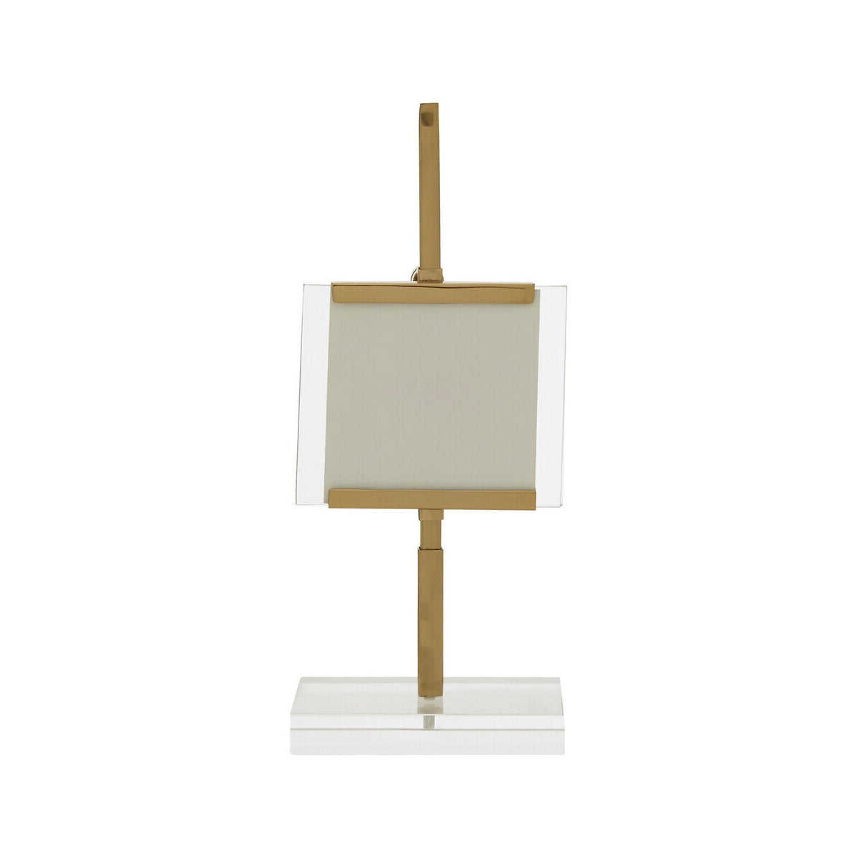 This photo frame has a gold finish stainless steel frame featuring an easel design which holds a white canvas-like background for displaying photographs. The frame has a rectangular acrylic base which contrasts the translucent, front panel. Small, removable bolts on the back of the luxe frame can be unscrewed effortlessly to fix a picture.