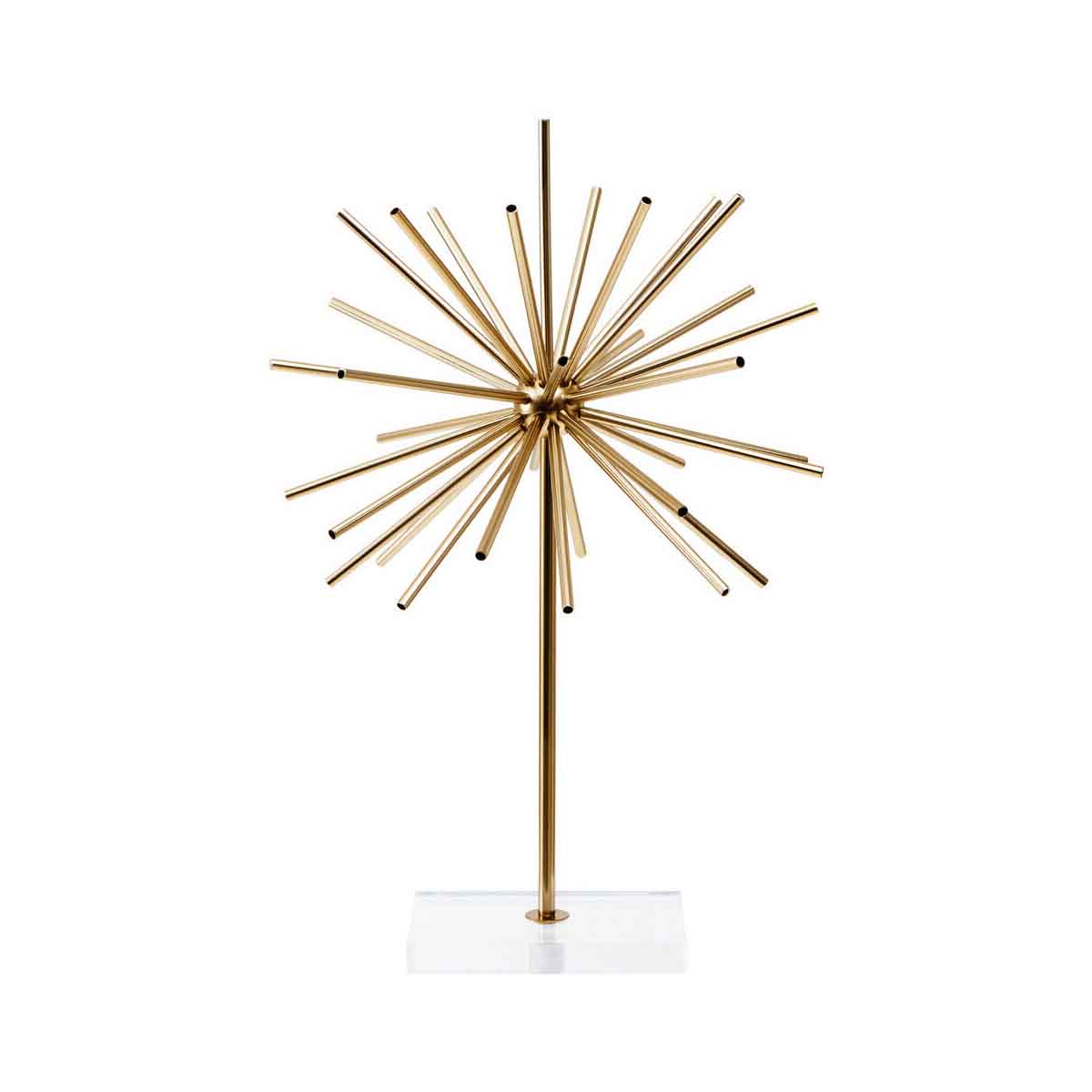 This metal sculpture showcases vertical rods protruding from a sphere in the centre, creating a captivating visual appeal. The lustre of the metal is counterpointed by the simplicity of the acrylic plinth base.