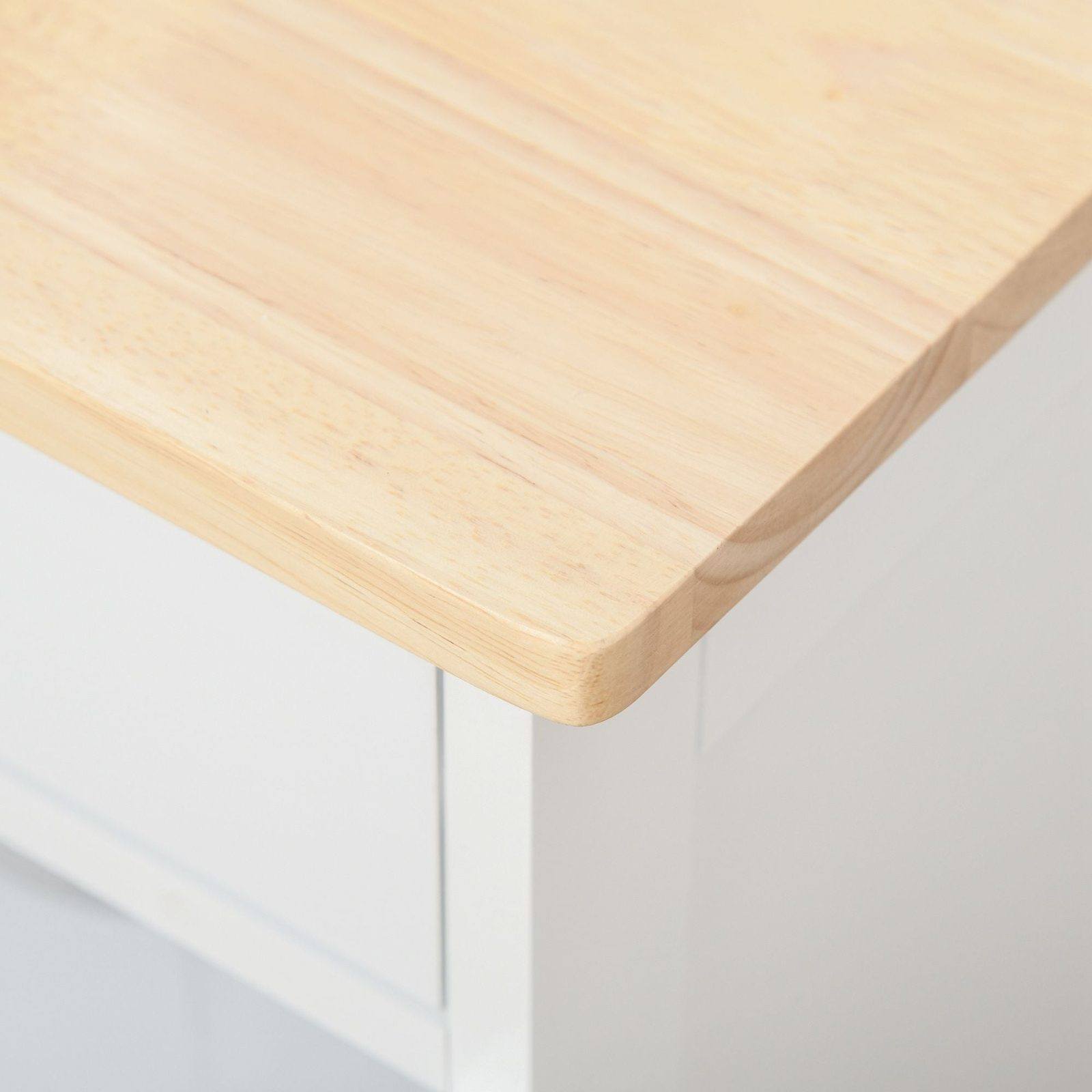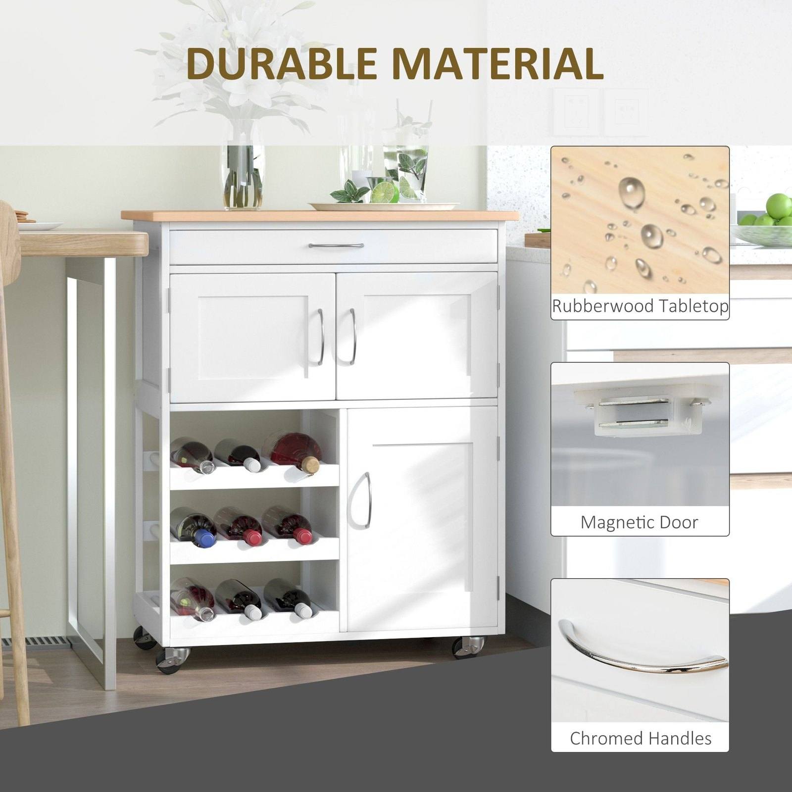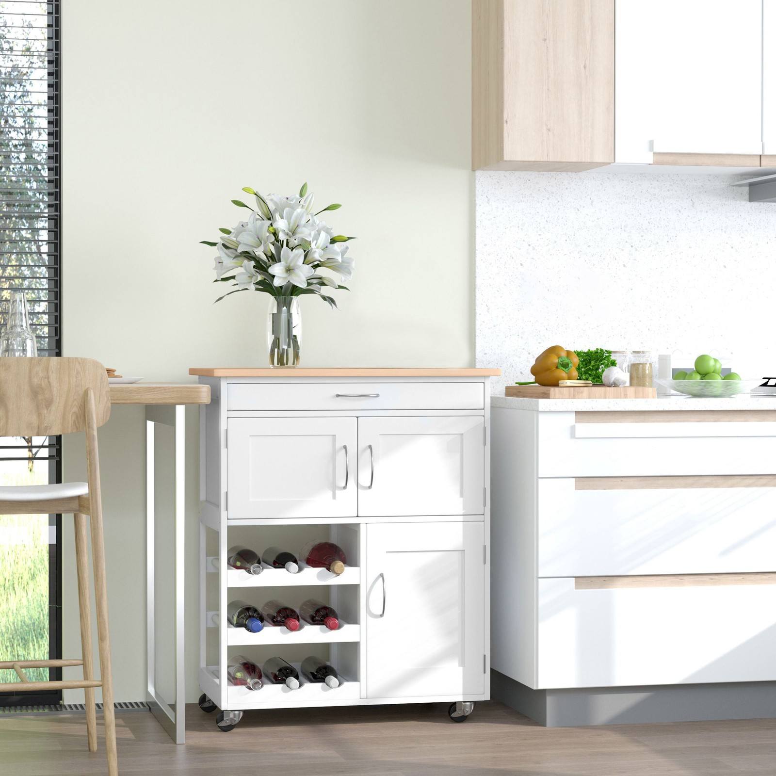 This storage trolley on wheels is an ideal option for any kitchen and dining space - no matter the size. Comes with a drawer, three three-bottle wine shelves and three cabinets provide plenty of room for holding everything together. Wheels allow you to move it where you desire. The rubberwood countertop is hard and ideal for prepping drinks garnishes when friends come over. Simple, white clean design - a modern home addition.
