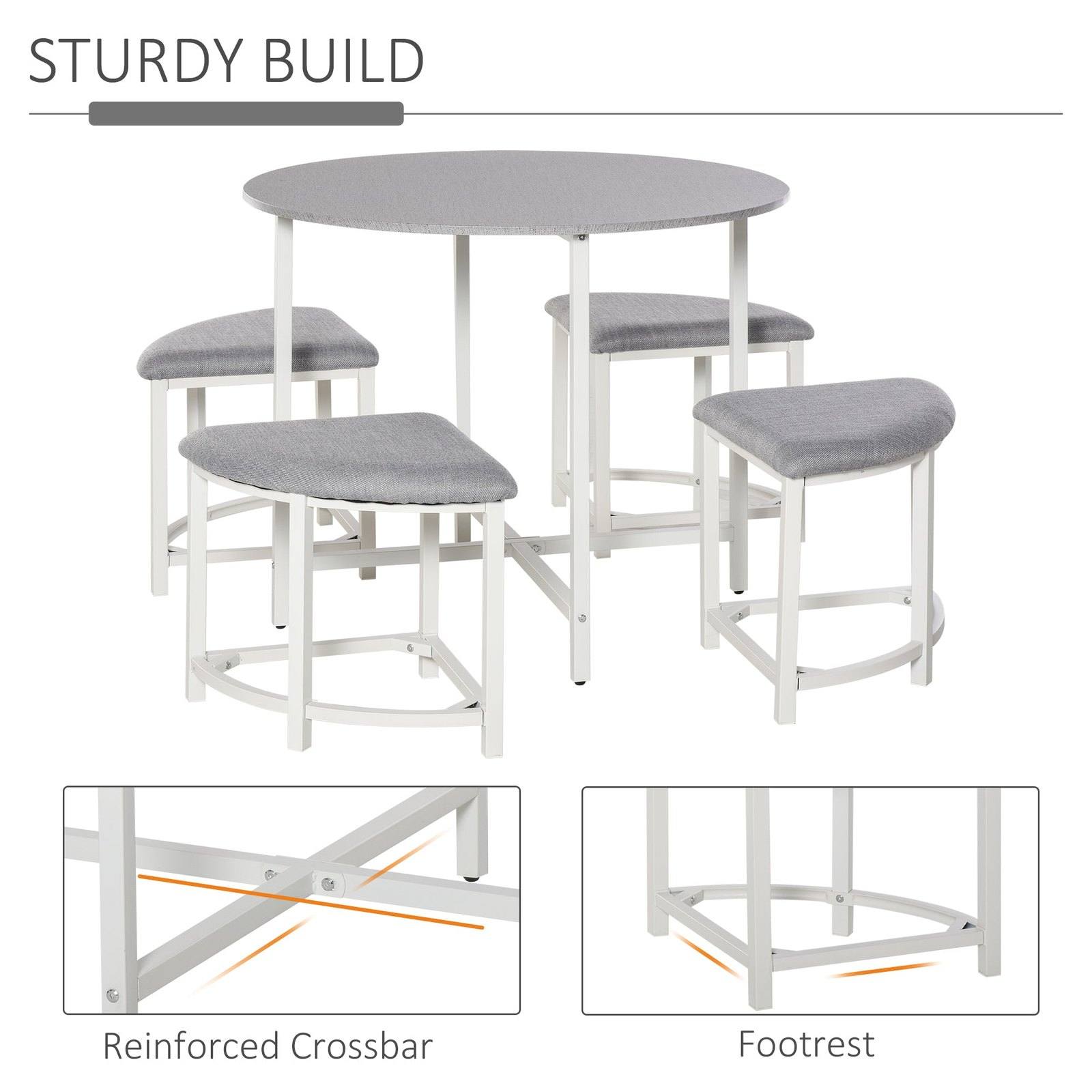 Comfortable and compact seating you won't want to miss out on. This five-piece dining set from HOMCOM is a must for making those meals times even more special and memorable. Comes with four stools and large round table, in a modern grey and white colour scheme. The armless stools allow you to sit freely, with the triangle shape tucking under the table for easy storage. Stools are fitted with a padded cushion seat, and the table comes with a durable and flat MDF top. Finished with bottom bar on all pieces to hold you feet comfortably.