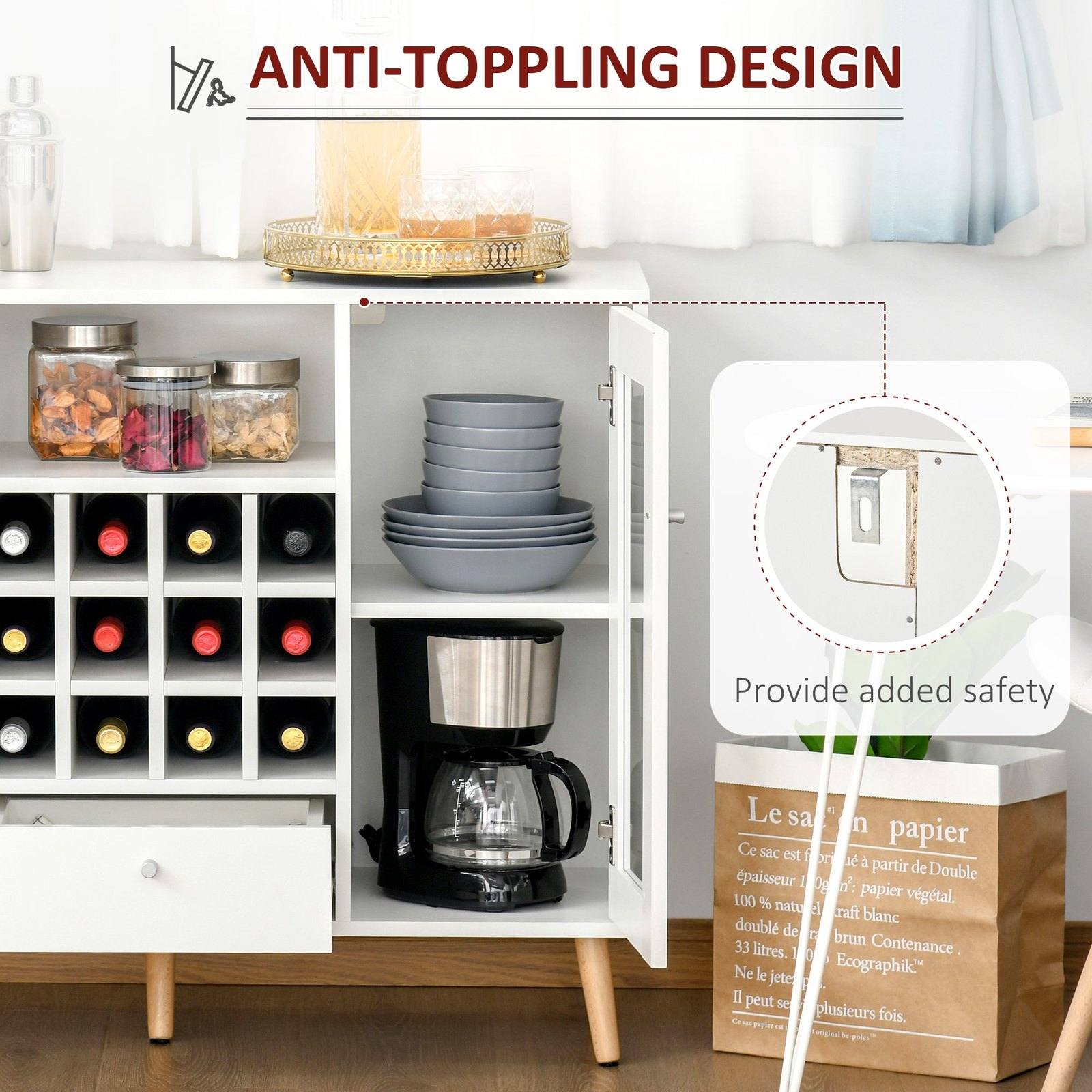 Make home dining storage easy and stylish with this multi-use cabinet from HOMCOM. Generous in features, it combines a 12 bottle wine rack, top shelf, small drawers and a cupboard on both ends -giving you lots to ensure your space is kept tidy and organised. The two cupboards are fitted a shelf for extra organisation. Made from particle board, this piece is durable for everyday use, with the five wooden legs keeping it steady on the ground. Finished with glass panels on the door for a sleek look and handles to open and close them easily.