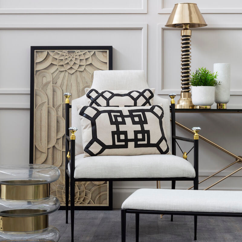 The black metal frame boasts tapered legs that add to the chair's elegant aesthetic. The cushions on the seat and backrest are made from soft linen and feature button tufting and a natural finish.