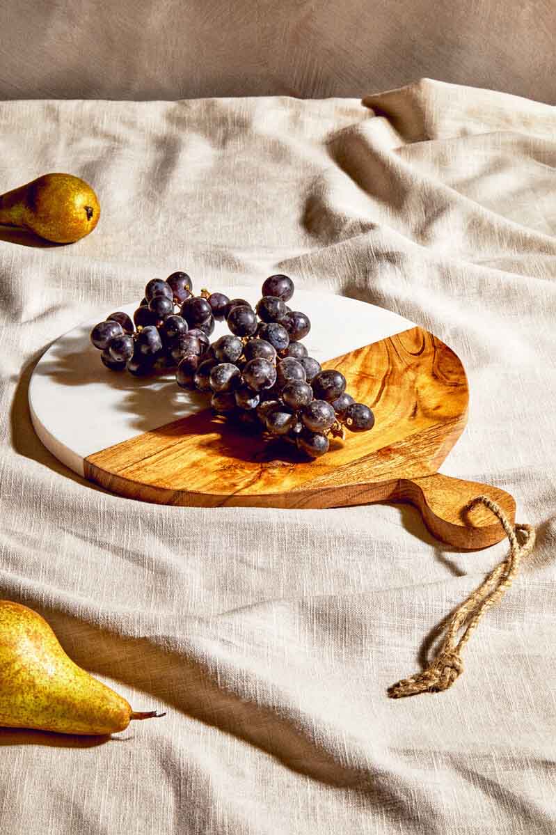 This small paddle board boasts a round shape with a marble and acacia wood surface that provides durability for regular chopping or serving of items. The board comes with a hole on its handle for a hanging string.