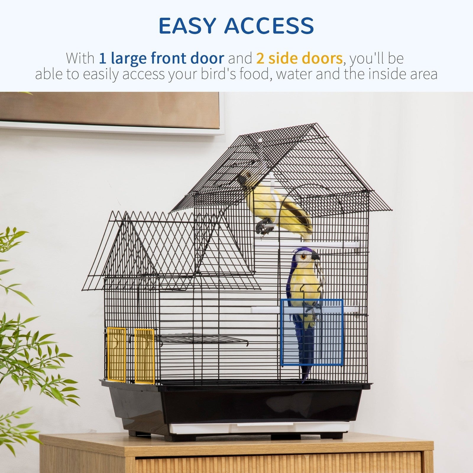 Upgrade your pet's home with this PawHut bird cage. Birds will rest on the two perches or the swing ring, where they'll flap and stretch their wings in this spacious habitat they won't feel boxed in. The pull-out tray at the bottom makes cleaning a breeze, keeping their living space tidy and comfortable. Food and water are provided through the two small doors and food containers, whilst the other large door provides easy access. Invest in their happiness and comfort and watch them thrive.