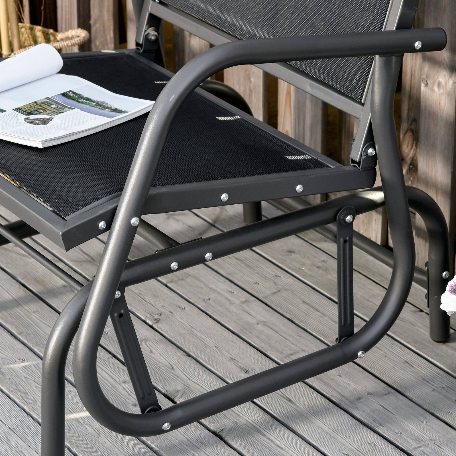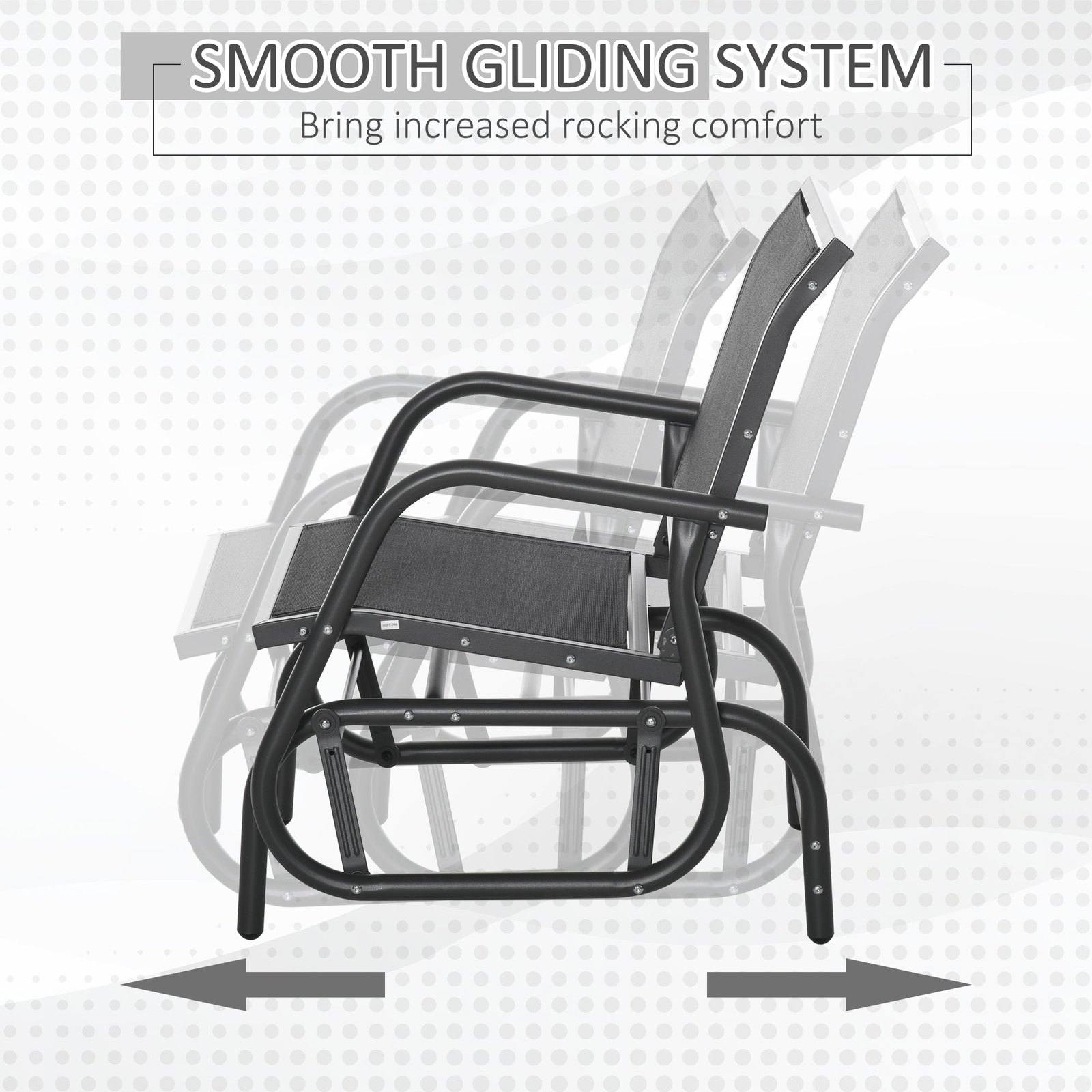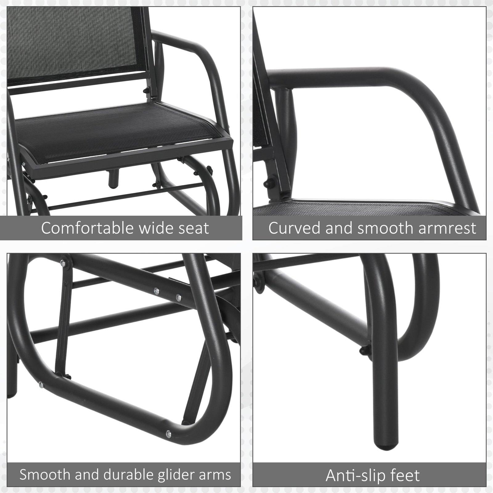 Glide the day away ever so smoothly with this garden rocking chair from Outsunny. Using steel for a structure which is durable and supports up to 120kg, our outdoor rocking chairs for adults are crafted into a unique swinging design, which moves back and forth gently - perfect for those relaxing afternoon naps. And the garden seat features a curved back, mid-rise armrests and breathable mesh fabric on the seat and back, allowing your skin to breathe easily. Finished with anti-slip feet.