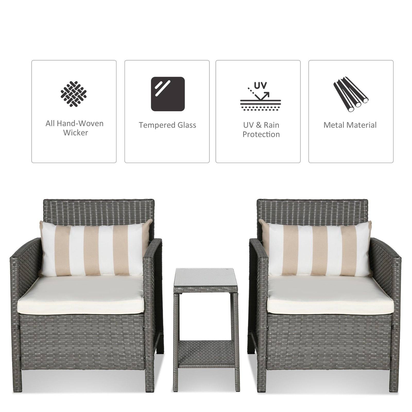 Make the right choice for the upcoming Summer season  choose this three-piece dining set from Outsunny for endless hours of comfort and joy. In a contrasting cream tone, thick cushions are placed on the seats for comfort, with a stylish striped bolster cushion also included for extra style  all with removable covers which can be washed clean to keep them fresh and hygienic. The set is completed with a matching two-tier table, with a tempered glass top for a chic finishing touch.