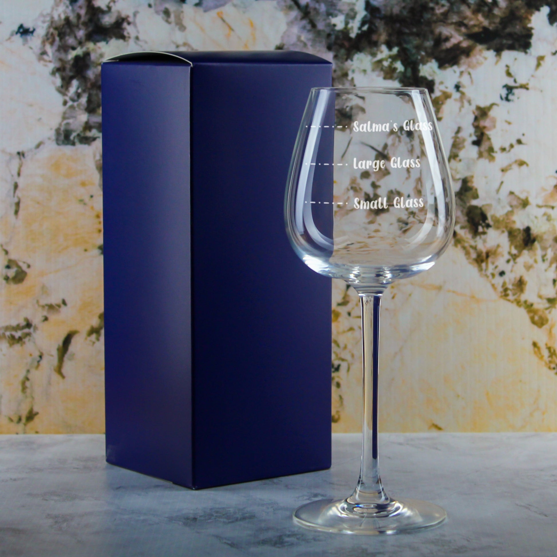 Searching for the perfect gift for the wine aficionado in your life? Our Personalised Engraved Wine Emotions Wine Glass with Name's Glass Measurements Design is the ideal gift for any wine lover! The perfect present for a best friend's birthday, your colleague's retirement, a mum who needs a massive measure on Mothers Day or other occasions, this glass is engraved with a handwritten design that displays small and large glass measurements beneath a dramatized extra large measure labelled with the recipients name. With the exaggerated measure, this is sure to make anyone smile or laugh as they open this gift - paired with a stunning blue and gold decorated gift box, this is a present that is ready to wow. Using our laser engraving system, both the novelty design and your customisation will be etched onto the glass, ensuring for a timeless gift to be cherished indefinitely; as this is permanently engraved into the glass, neither your personalisation nor the design will ever wash off. Give the perfect gift for any wine enthusiast for any event with their own personalised wine measures glass.