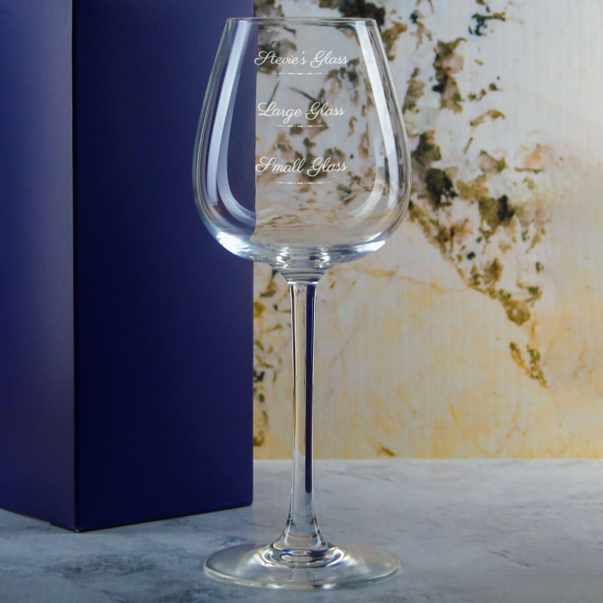 Searching for the perfect gift for the wine aficionado in your life? Our Personalised Engraved Wine Emotions Wine Glass with Name's Glass Measurements Design is the ideal gift for any wine lover! The perfect present for a best friend's birthday, your colleague's retirement, a mum who needs a massive measure on Mothers Day or other occasions, this glass is engraved with a script design that displays small and large glass measurements beneath a dramatized extra large measure labelled with the recipients name. With the exaggerated measure, this is sure to make anyone smile or laugh as they open this gift - paired with a stunning blue and gold decorated gift box, this is a present that is ready to wow. Using our laser engraving system, both the novelty design and your customisation will be etched onto the glass, ensuring for a timeless gift to be cherished indefinitely; as this is permanently engraved into the glass, neither your personalisation nor the design will ever wash off. Give the perfect gift for any wine enthusiast for any event with their own personalised wine measures glass.