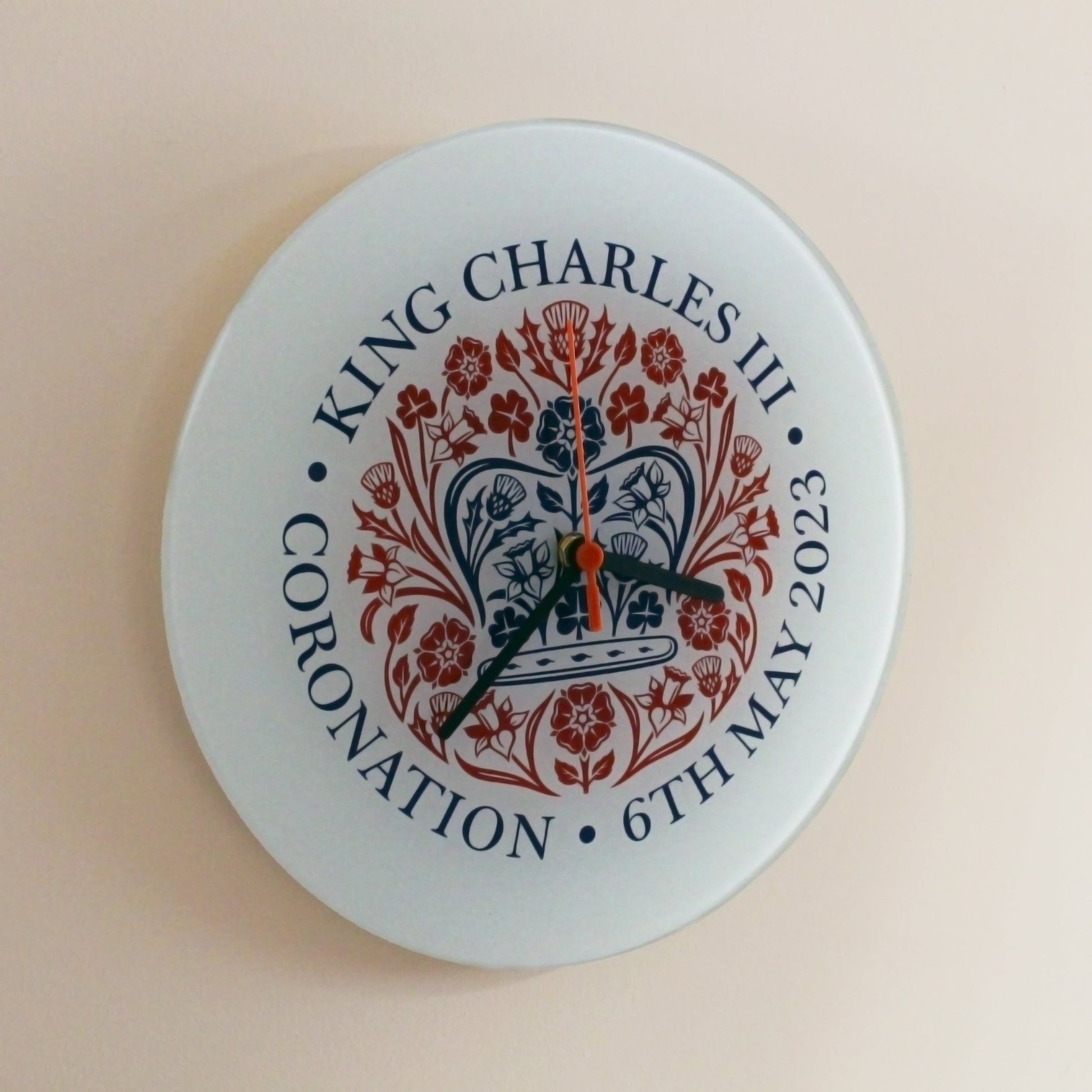 Celebrate the coronation of King Charles the III and the Queen Consort with our King's Coronation Emblem wall clock. Printed with the official Coronation Emblem for HRH on 6th May 2023, this clock makes for a sentimental piece to remember the historic, regal event; perfect for coronation parties and celebrations, a gift for a royal family fan or even as a keepsake for the coronation, this clock suits all. The coronation emblem was created by Sir Jony Ive KBE and his creative collective LoveFrom, and displays St Edward's crown comprised of the flora from the four nations of Great Britain. Printed with our specialist printing system, the featured emblem will be permanently printed into the clock, ensuring this keepsake will be lasting and cherished for years to come. Measuring to 30cm in diameter, this wall clock is made from toughened glass and comes complete with a mechanism and hands. This coronation wall clock is the perfect way to show support to the monarchy and a great token to remember the King's Coronation.