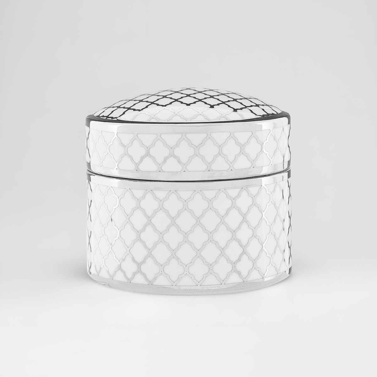 This large box is made from tactile ceramic, and has a glazed finish that adds to its reflective aesthetic. It features a silver quartefoil pattern on cool white, suitable for styling with geometric textiles and accessories.