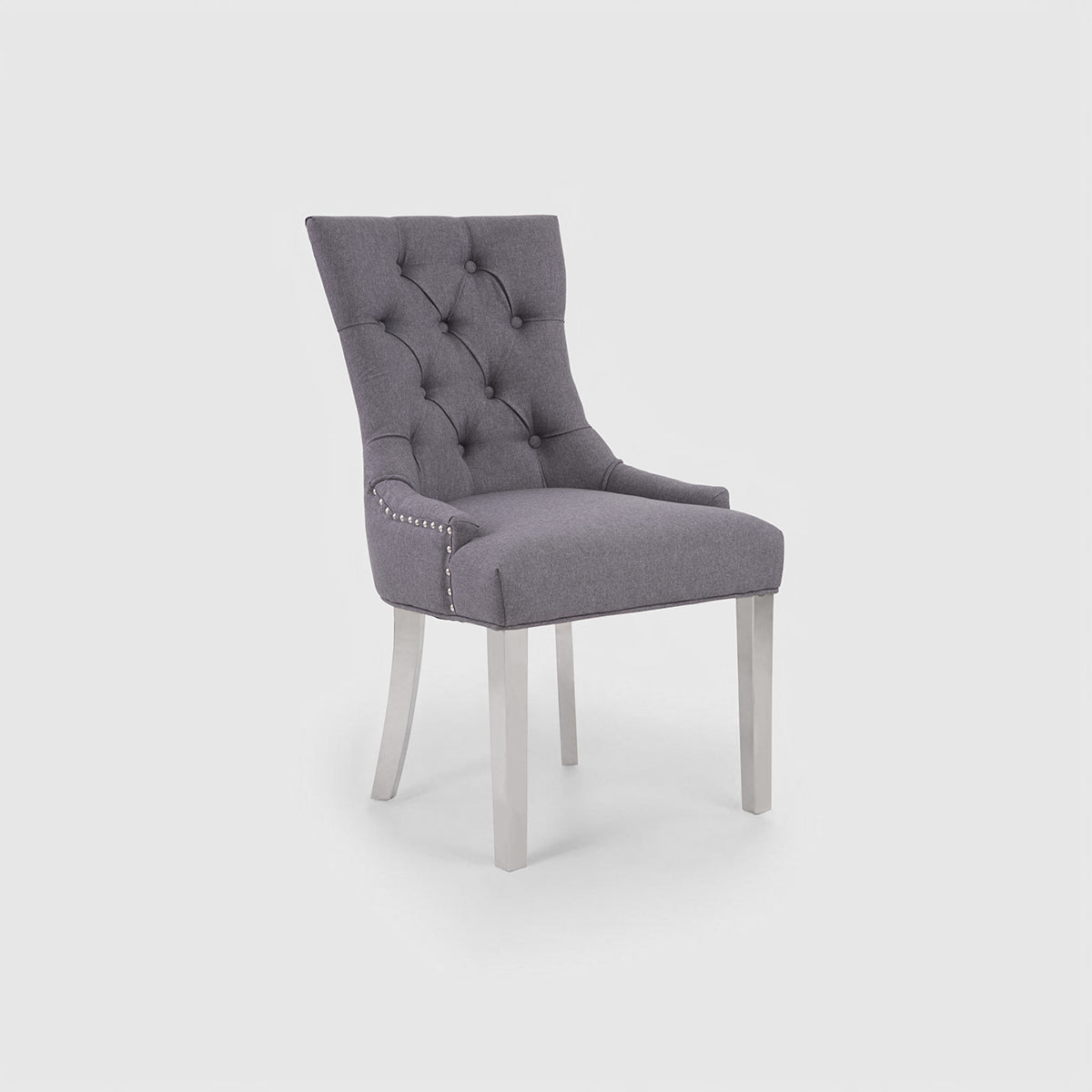 Minimal yet stylish, this dining chair has sledge legs at the back and straight legs at the front. The button-backed grey upholstery is tufted in a diamond pattern, giving a classic flair to the aesthetic.