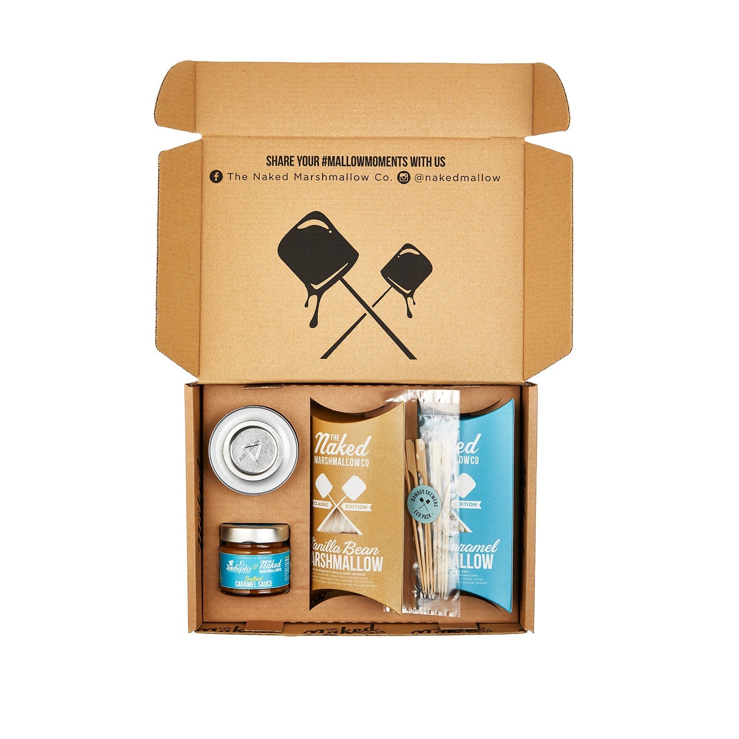 Our Salted Caramel lovers gift set comes perfectly presented in a printed kraft gift box and includes a set of bamboo skewers and toasting instruction guide.