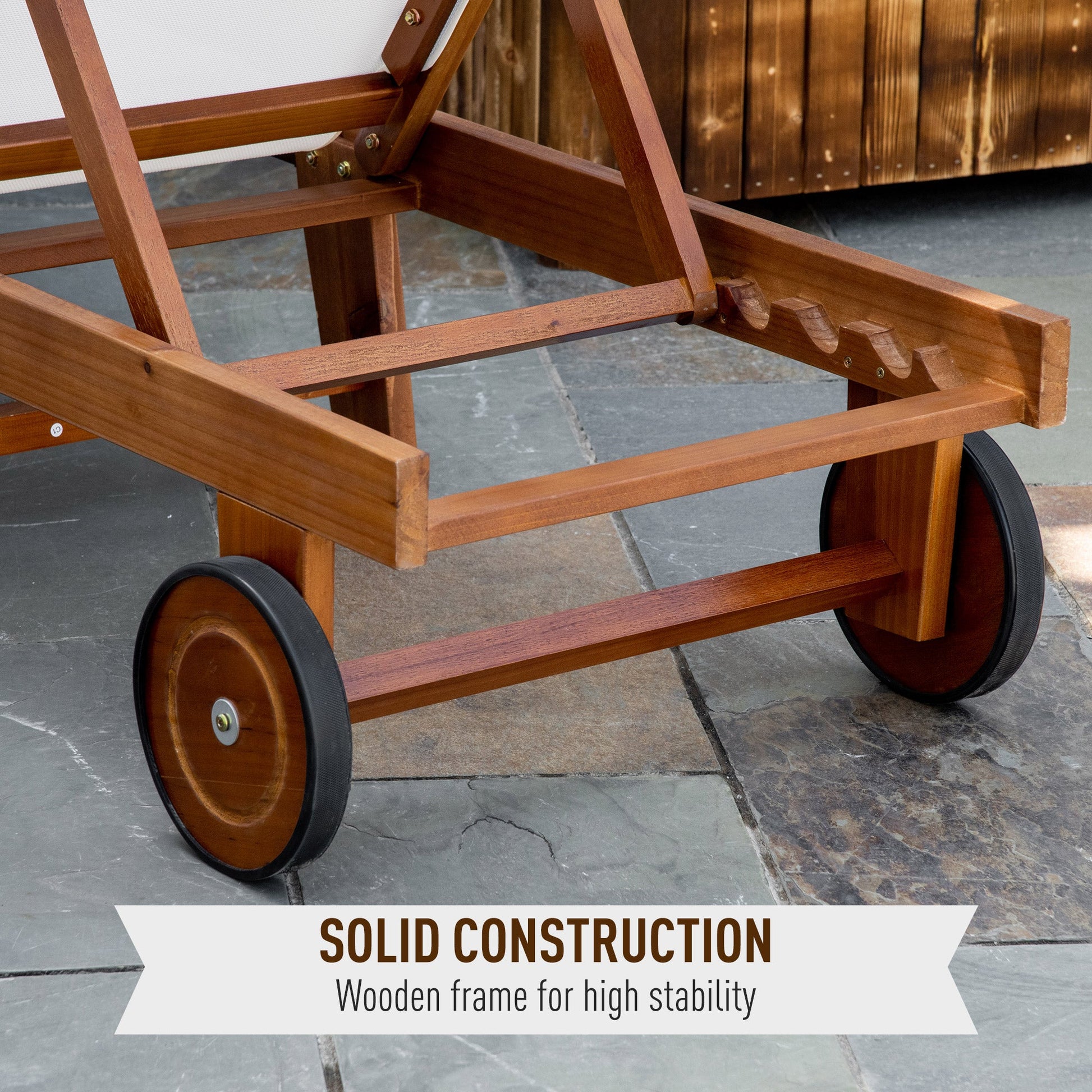 For complete relaxation in the sun, look to this lounger from Outsunny. Crafted from sustainably sourced acacia wood, it is both easy to clean and extremely durable to provide you many enjoyable years of use. Featuring two wheels to be moved around easily, it is finished with an adjustable backrest to position it however you like. Its the perfect piece of furniture for when the sun comes out to shine.