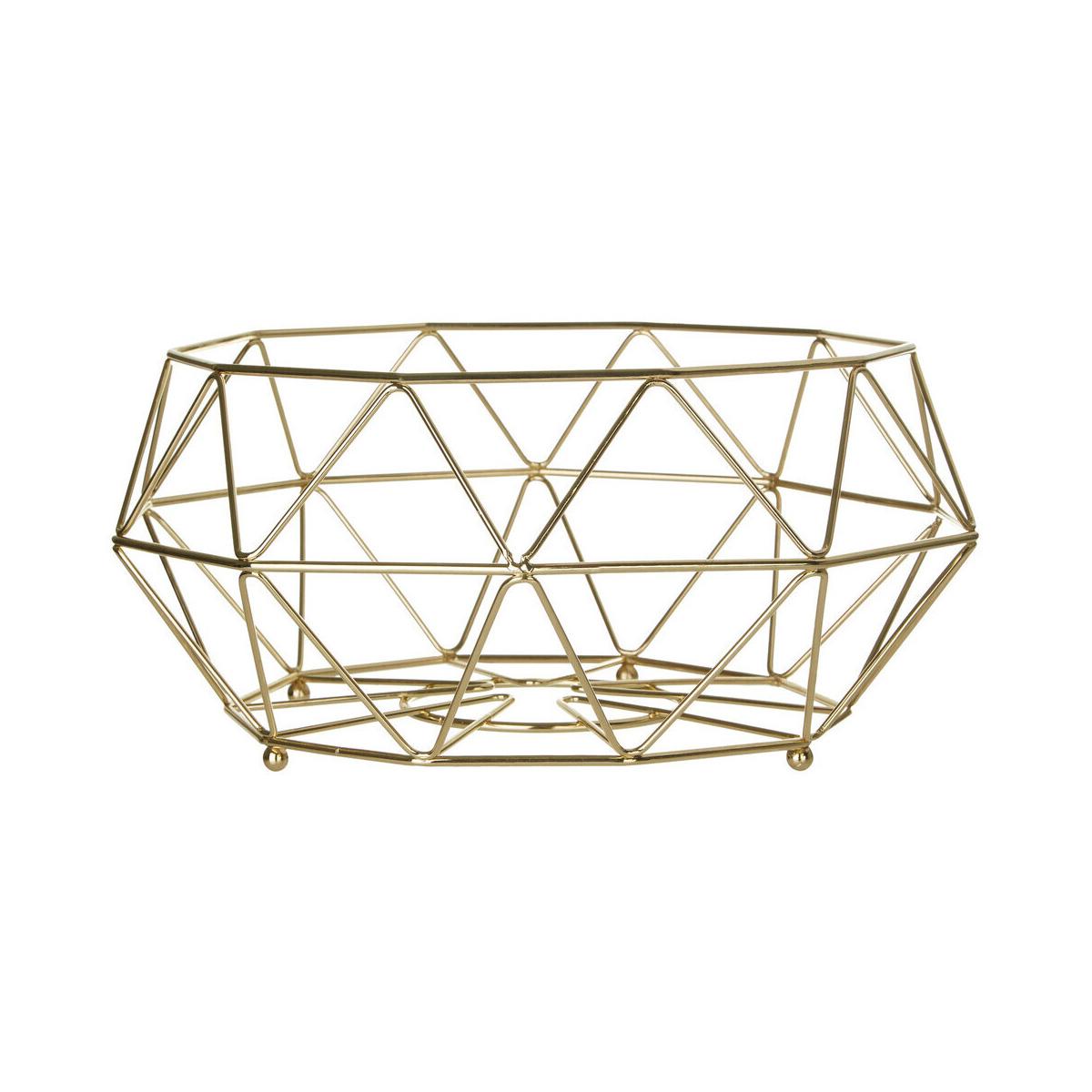 Made from strong iron, this fruit basket's minimalist wireframe construction benefits from a warm gold finish. Its geometric design results in two layers of triangles which combine to form a polygonal bowl shape. The tapered design allows it to hold fruit securely. Small rounded feet raise it from the surface of the table or worktop.