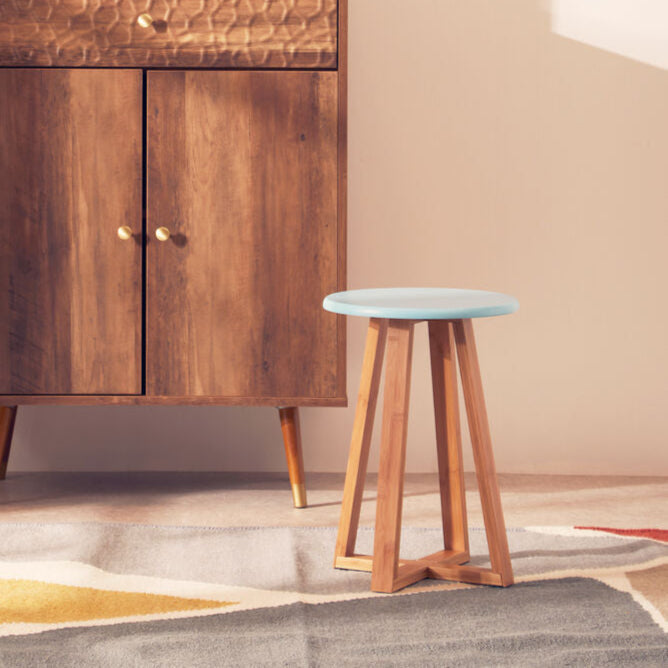 This stylish stool exhibits a minimalist profile, complementing Scandi-inspired interiors. The blue finish seating surface complements the natural finish bamboo frame that forms latticed feet. Ideal for seating in the kitchen or can be used as a footrest in the living room and hallway. This minimalist design stool is a functional and fashionable addition in any living space.