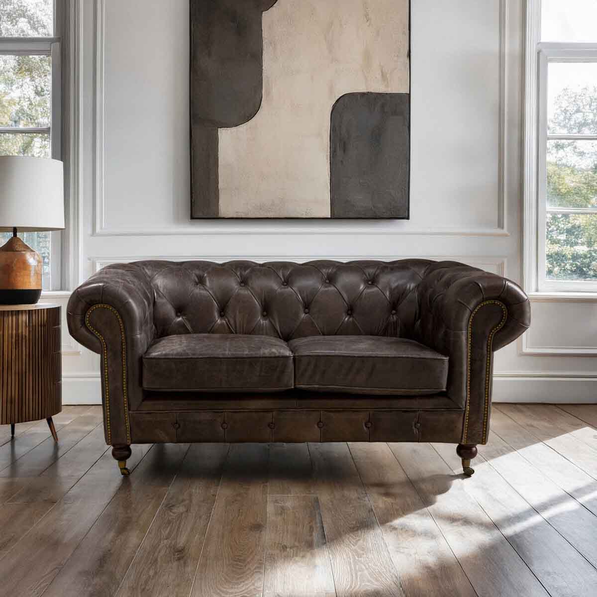 The Victor sofa is upholstered with dark grey leather and features carved walnut wood feet with caster wheels. The rolled armrests are accentuated by metallic stud detail, and its button tufted design gives it a standout heritage look.