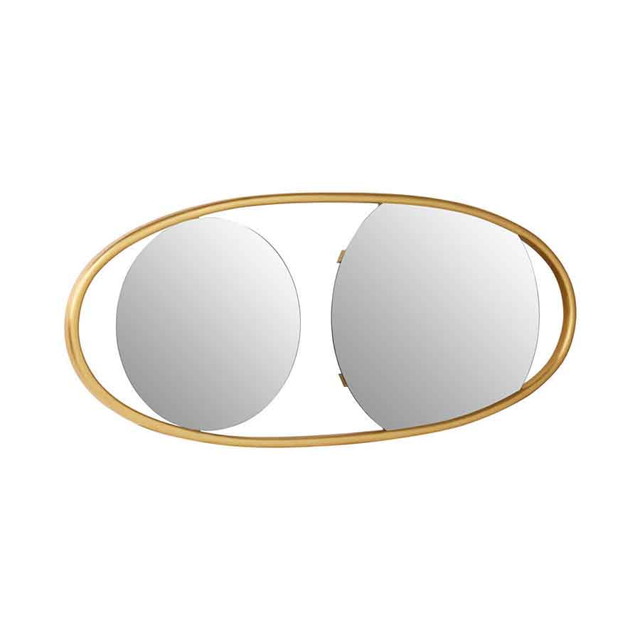 Its elongated, oval frame is crafted from solid mahogany wood. A pair of circular mirrors are set into the frame, complementing the frame's sweeping design lines. Display it above a console table in the hallway or living room.