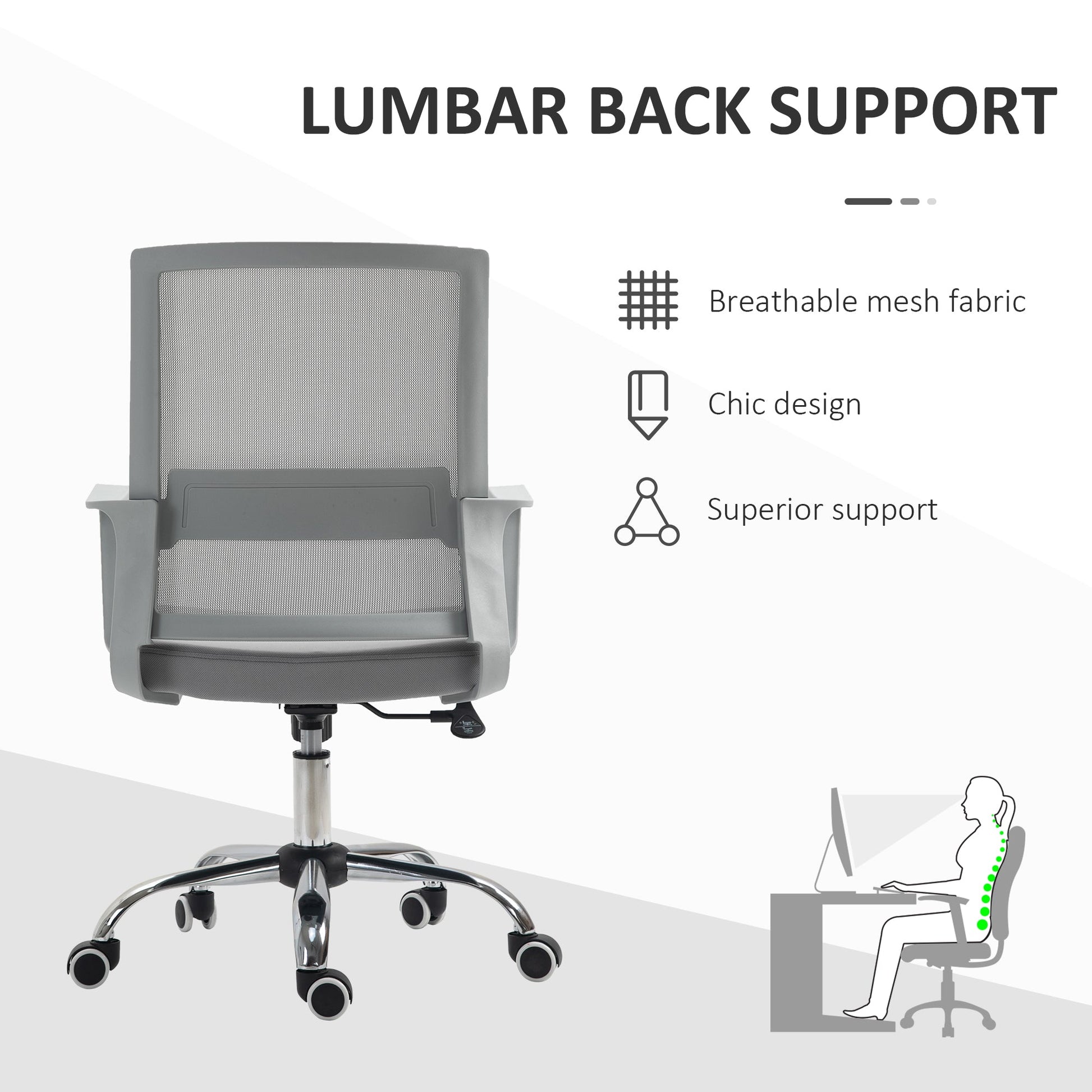Take on the workday in supreme comfort with this mesh chair from Vinsetto. Simple in design, yet effective in comfort, including a wide seat, adjustable height, a backrest, and mid-rise armrests. The swivel chair has a thick padded seat and a mesh backrest to allow your body to breathe whilst sitting back. With a 360° swivel base and 5 castor wheels, the pc chair allows you to move around easily whilst seated for extra efficiency. Work comfortably at home with this Vinsetto comfy chair.